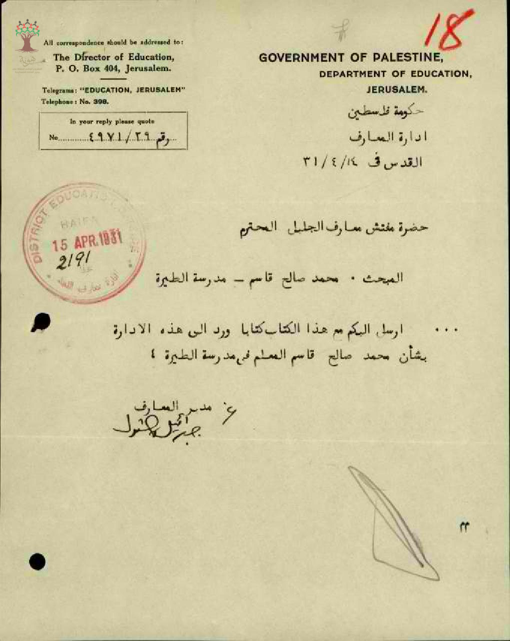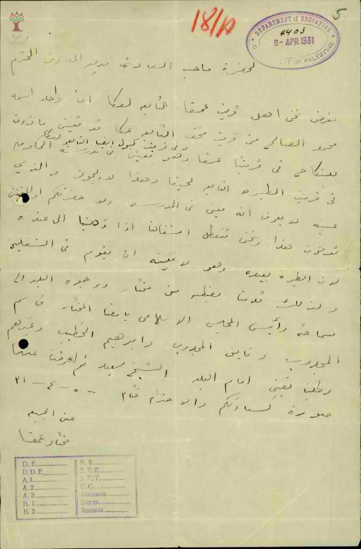 رسالة من مفتش المعارف الى مدير المعارف مرفقة برسالة من مختار قرية عمقا بخصوص تعييت المعلم محمد قاسم مأذونا في عمقا