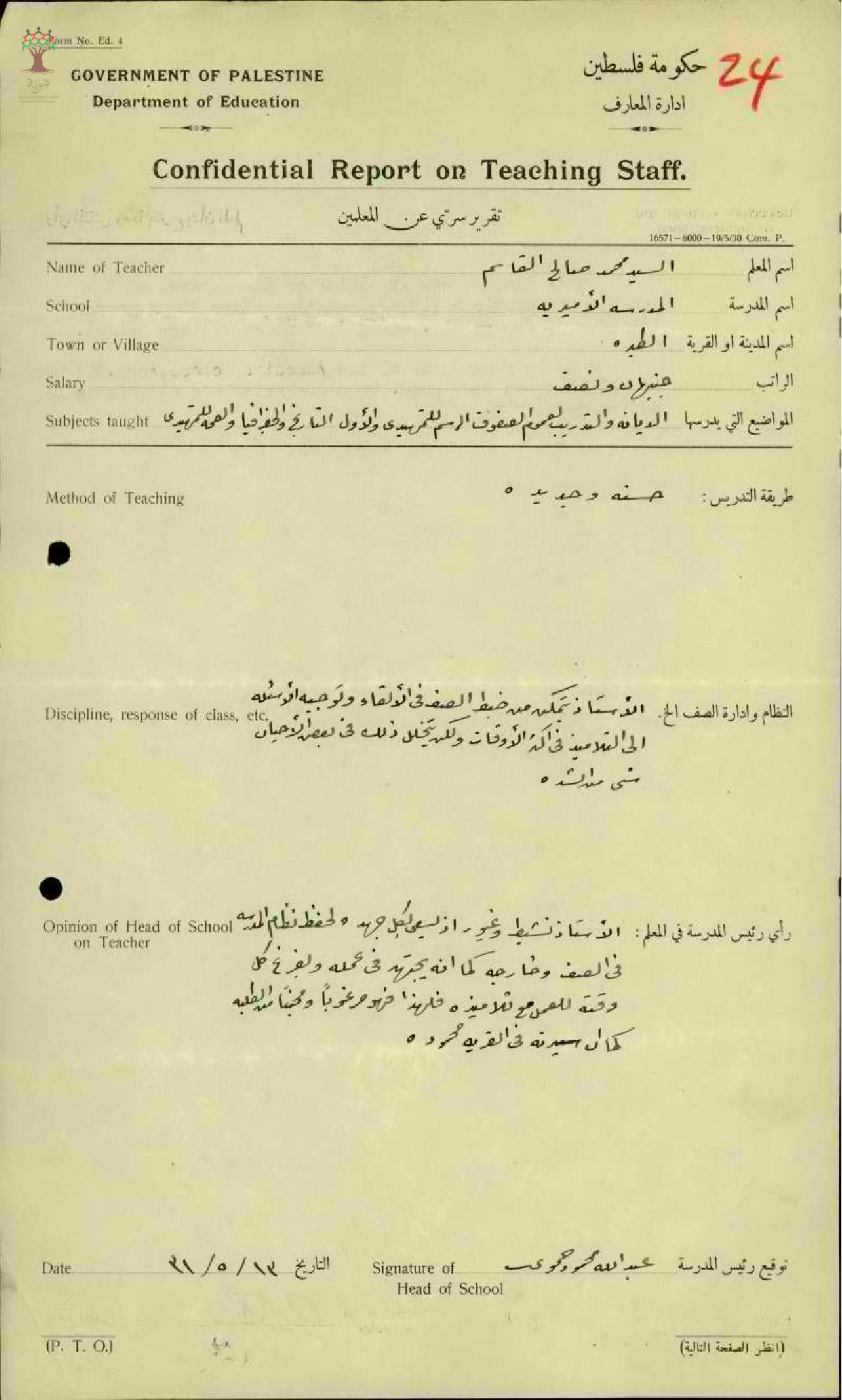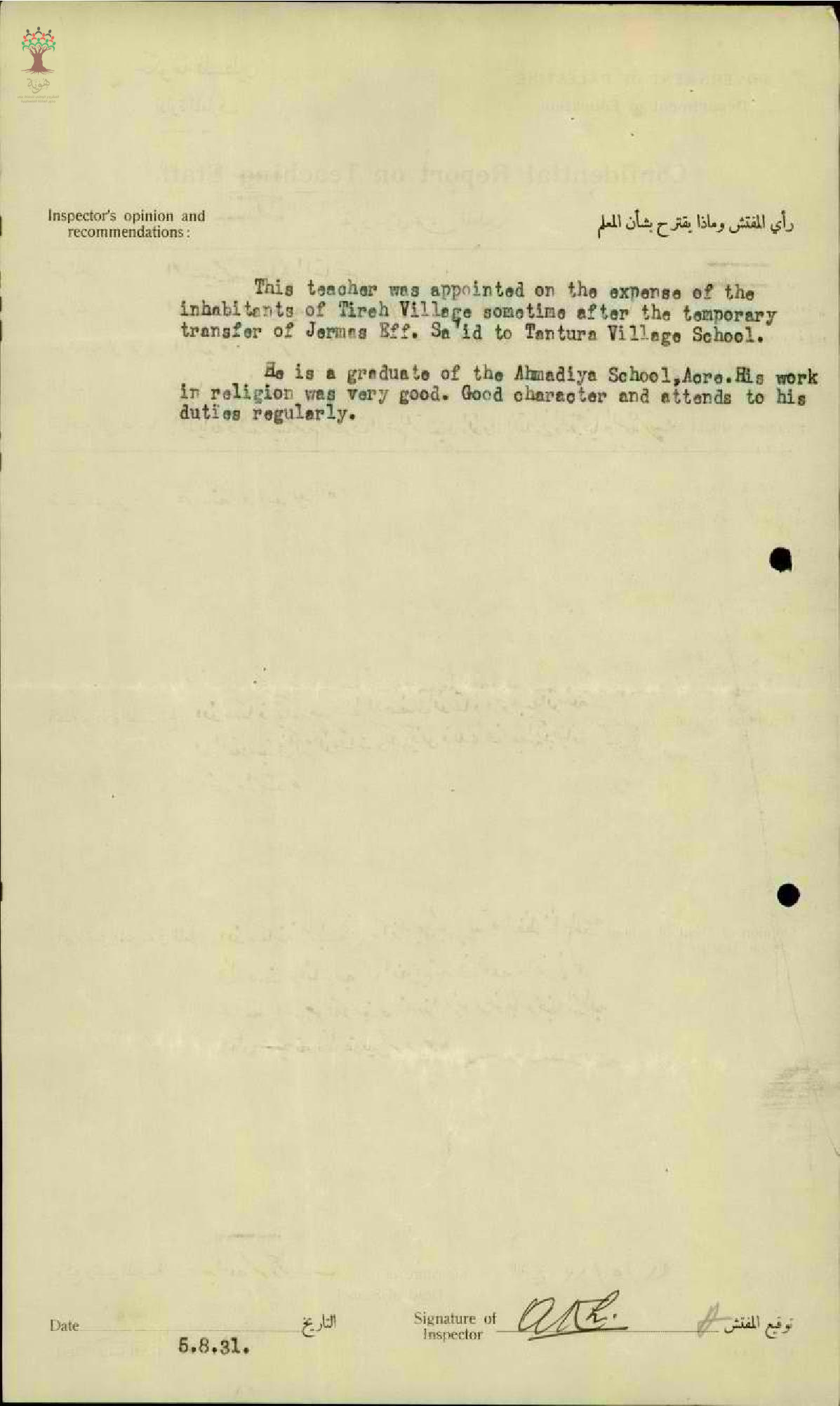 تقرير تفصيلي عن أداء المعلم محمد قاسم في مدرسة الطيرة سنة 1931