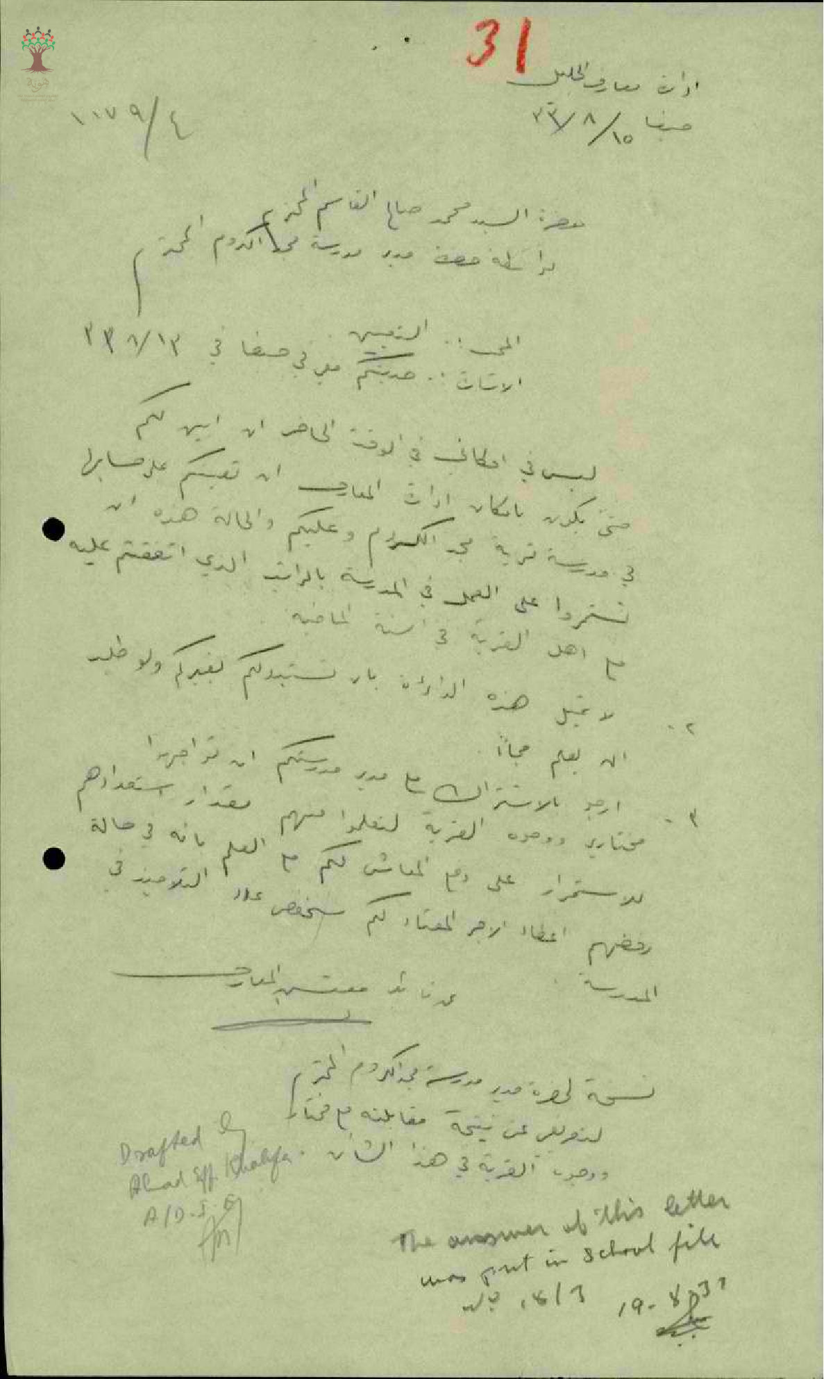 رسالة من مفتش المعارف الى المعلم محمد قاسم بخصوص تعيينه في مدرسة مجد الكروم