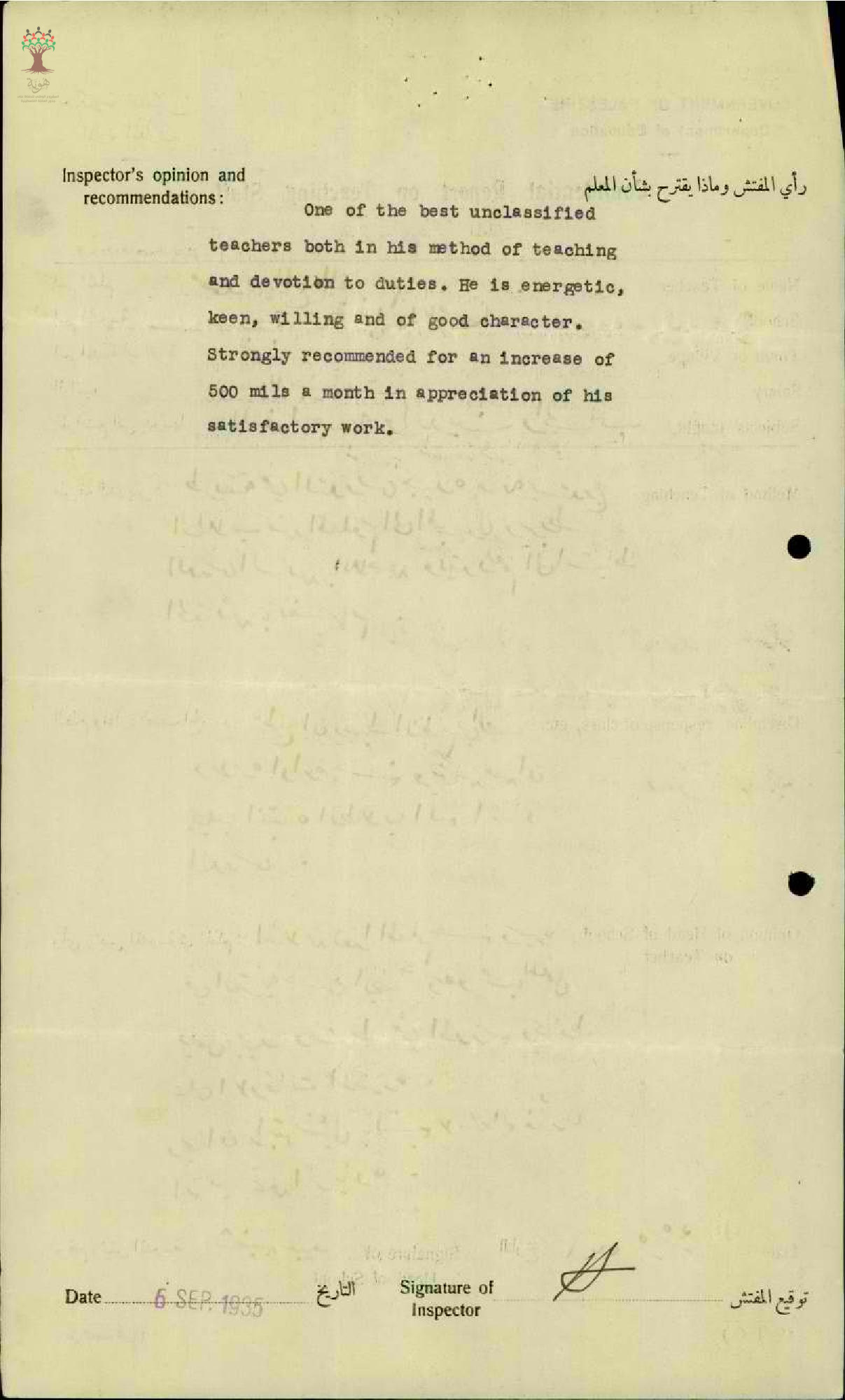 تقرير تفصيلي عن أداء المعلم محمد قاسم في مدرسة نحف سنة 1935