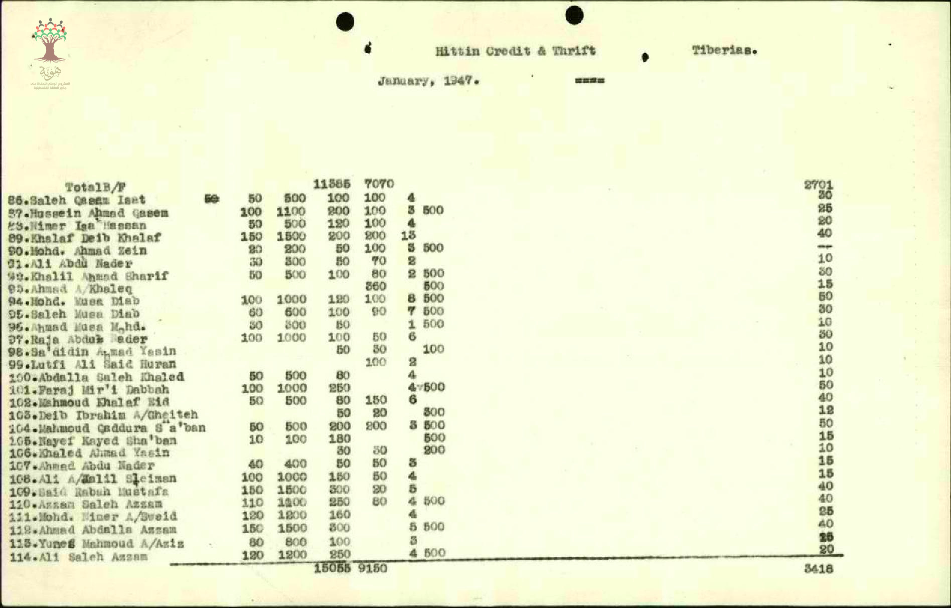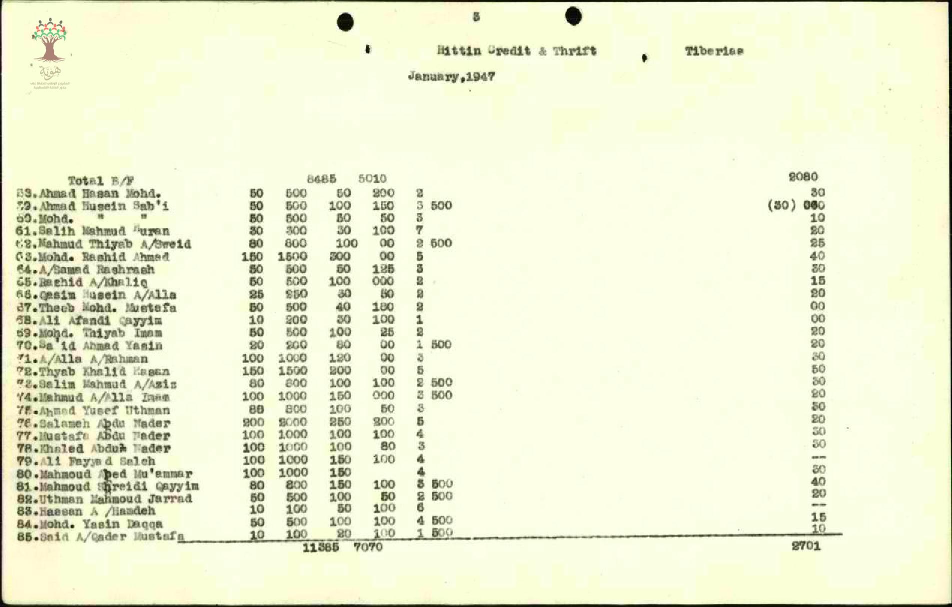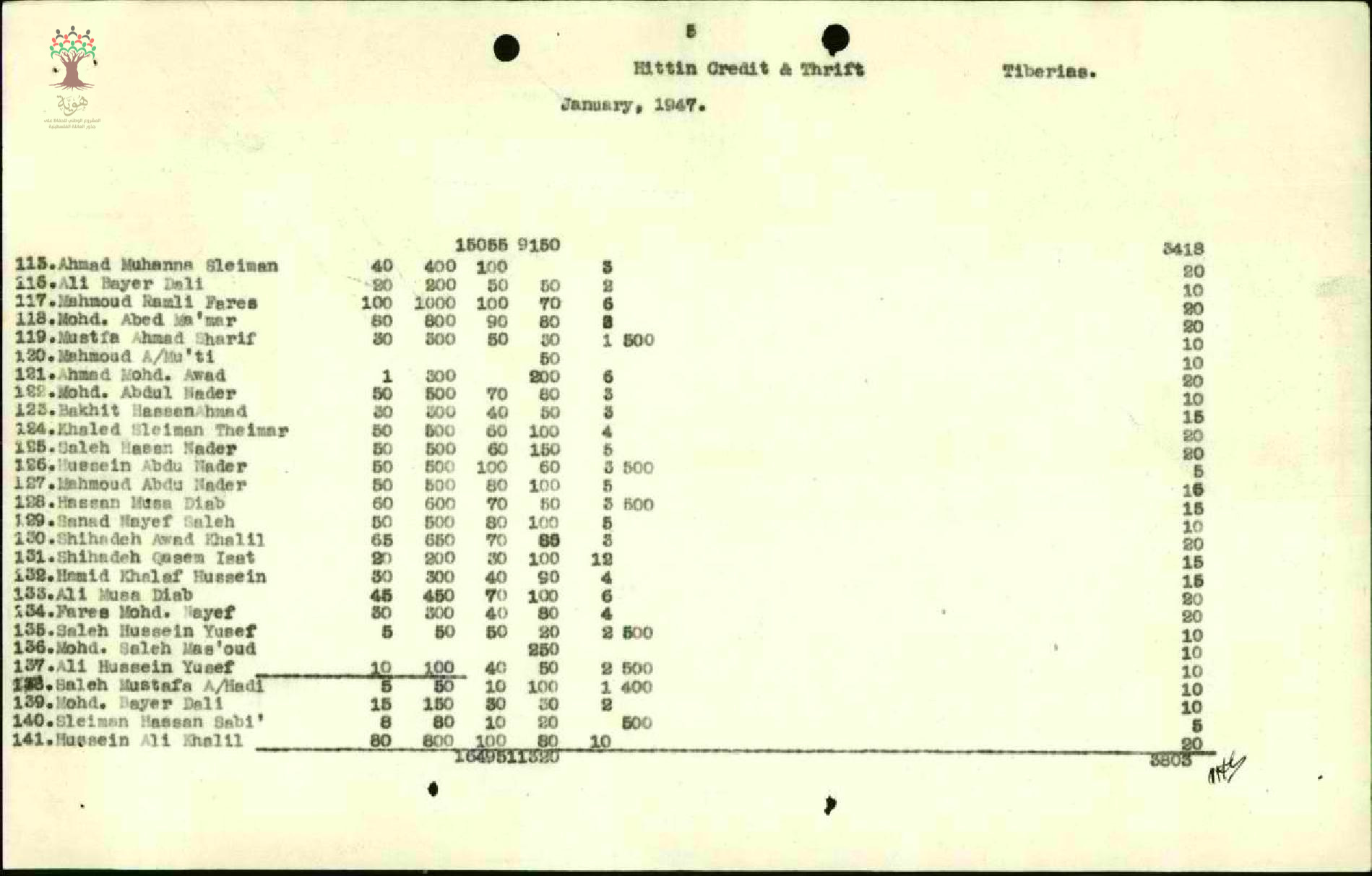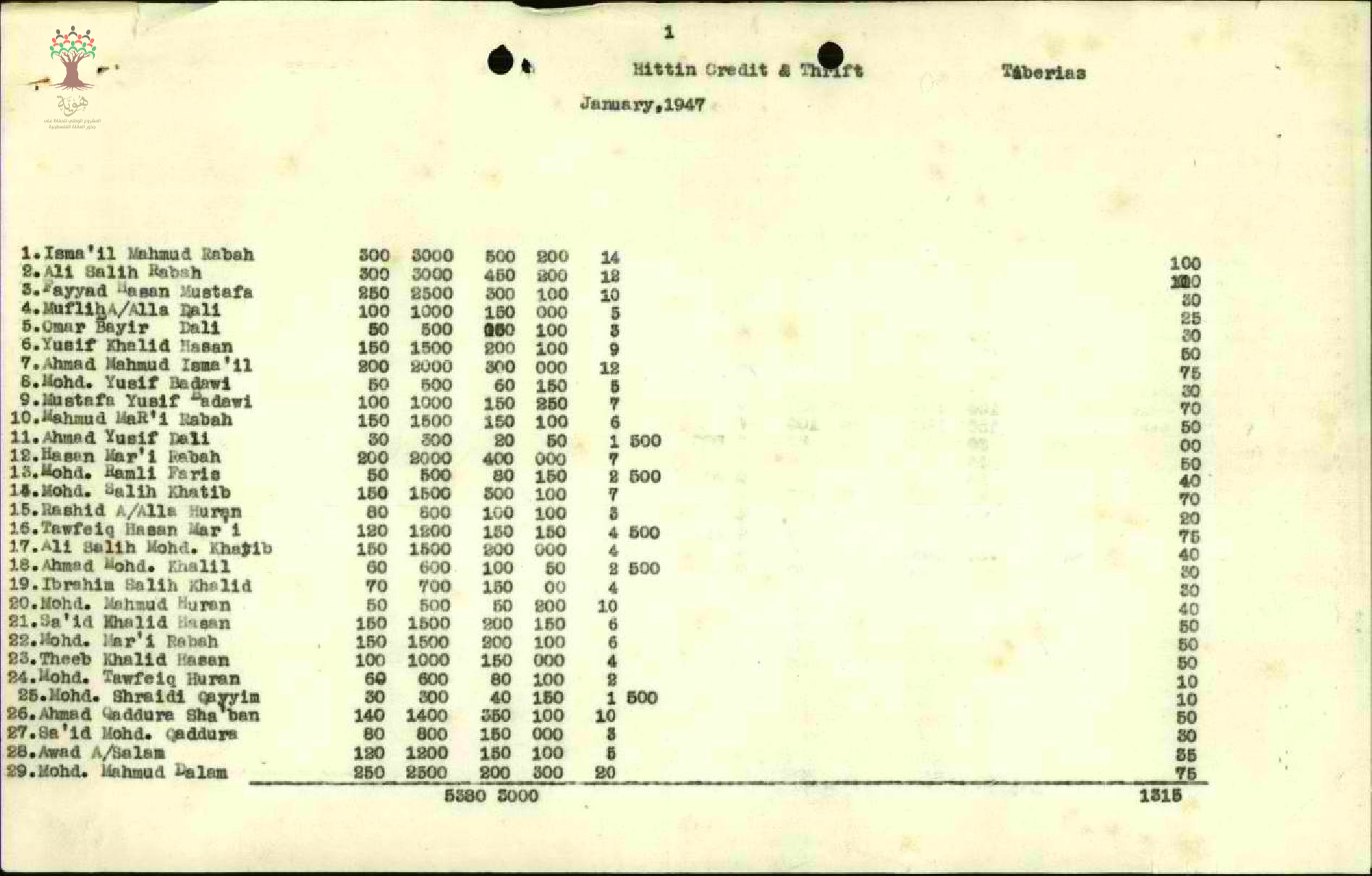 جداول تبين القرض والعمولة والأسهم والرهن لأعضاء جمعية حطين (1947) - باللغة الانجليزية