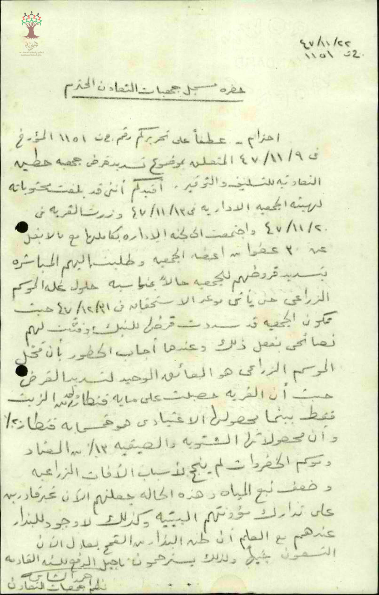 منظم الجمعيات التعاونية احمد الشامي يوضح لمسجل الجمعيات أسباب تخلف جمعية حطين عن سداد القروض وهي حصراً بسبب عدم نجاح الموسم الزراعي