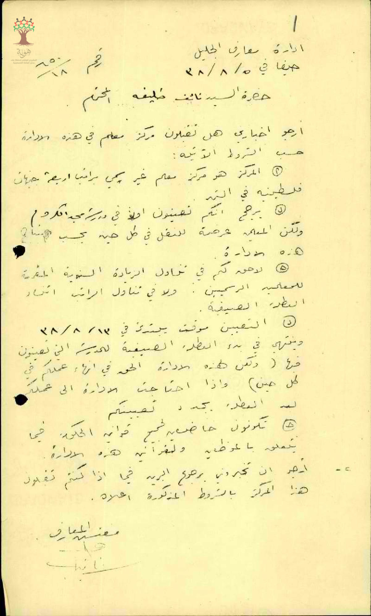عرض توظيف من دائرة المعارف مقدم الى المعلم نايف خليفة - صفد - مدرسة مجد الكروم والصواوين وعلما وجبع