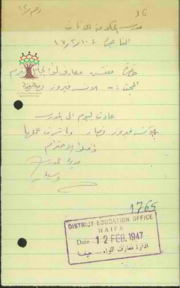 رسالة من مديرة مدرسة طبريا الى مفتش المعارف بخصوص عودة المعلمة فيروز نصار الى العمل