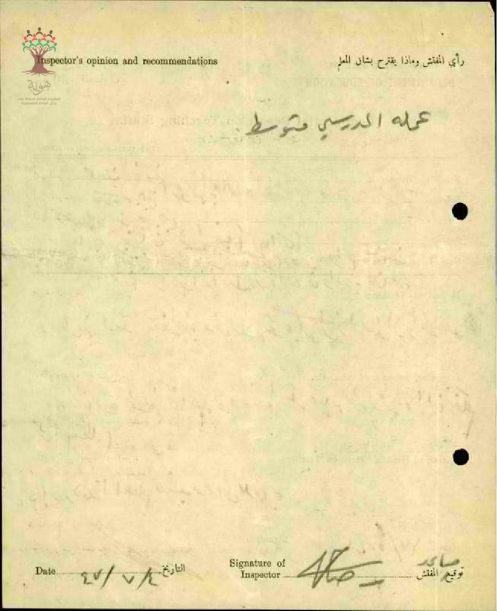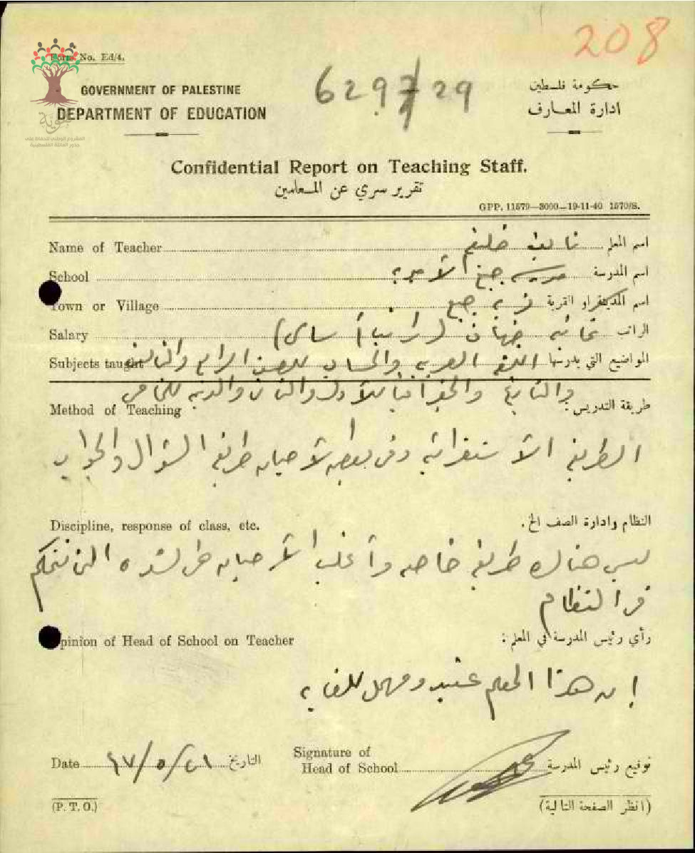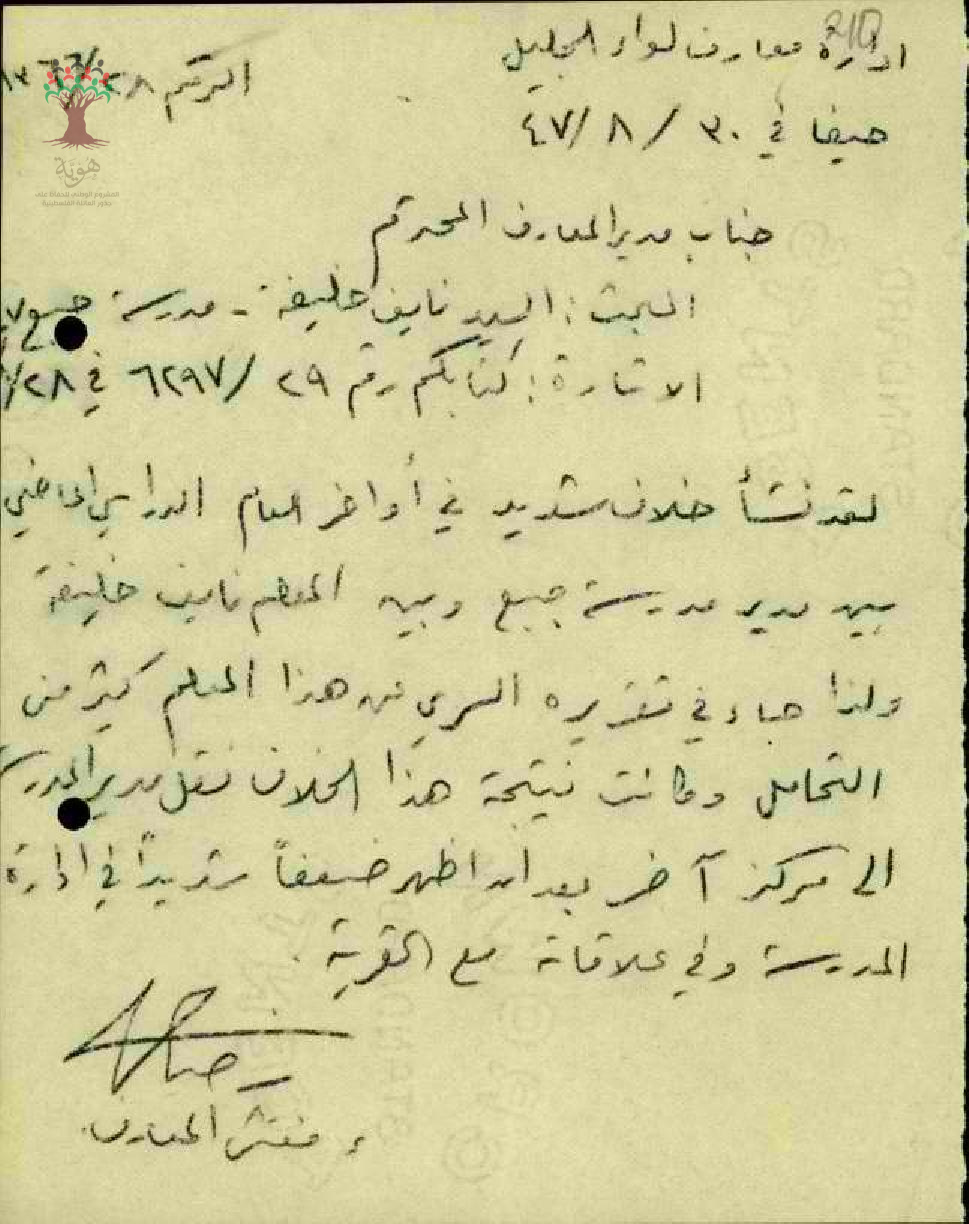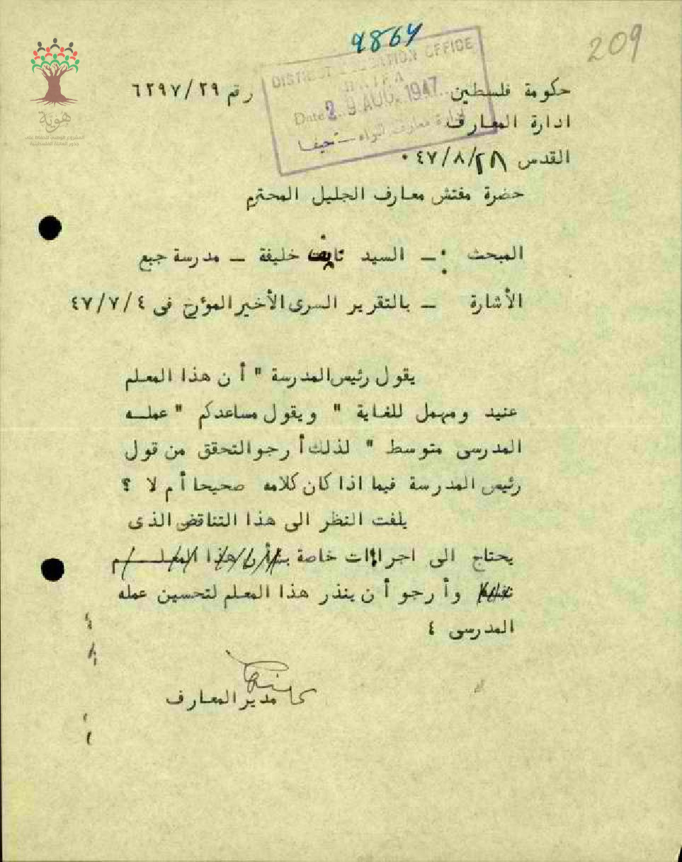 مراسلات بشأن رأي المدير بخصوص المعلم نايف خليفة - صفد - مدرسة جبع
