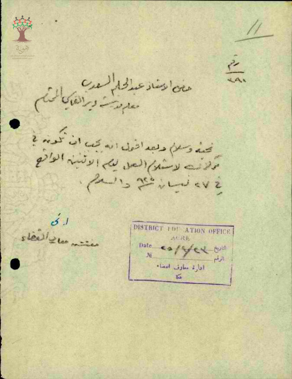 رسالة من مفتش المعارف الى المعلم عبد الحليم السعدي يخبره بضرورة عودته الى العمل
