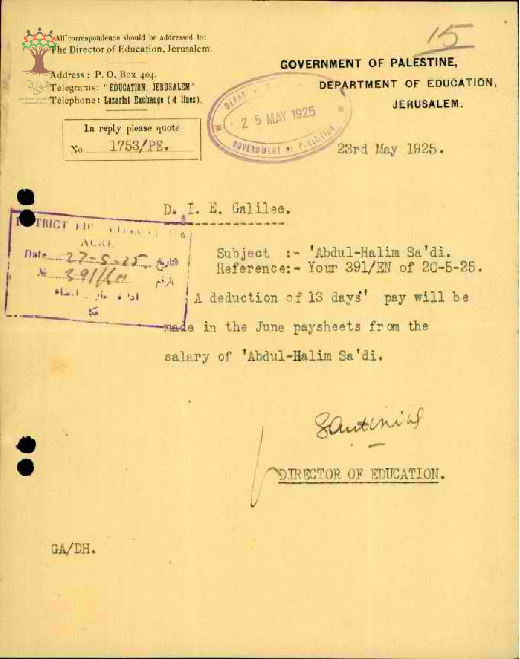 رسالة من مدير المعارف الى مفتش المعارف بخصوص خصم 13 يوما من راتب المعلم عبد الحليم السعدي