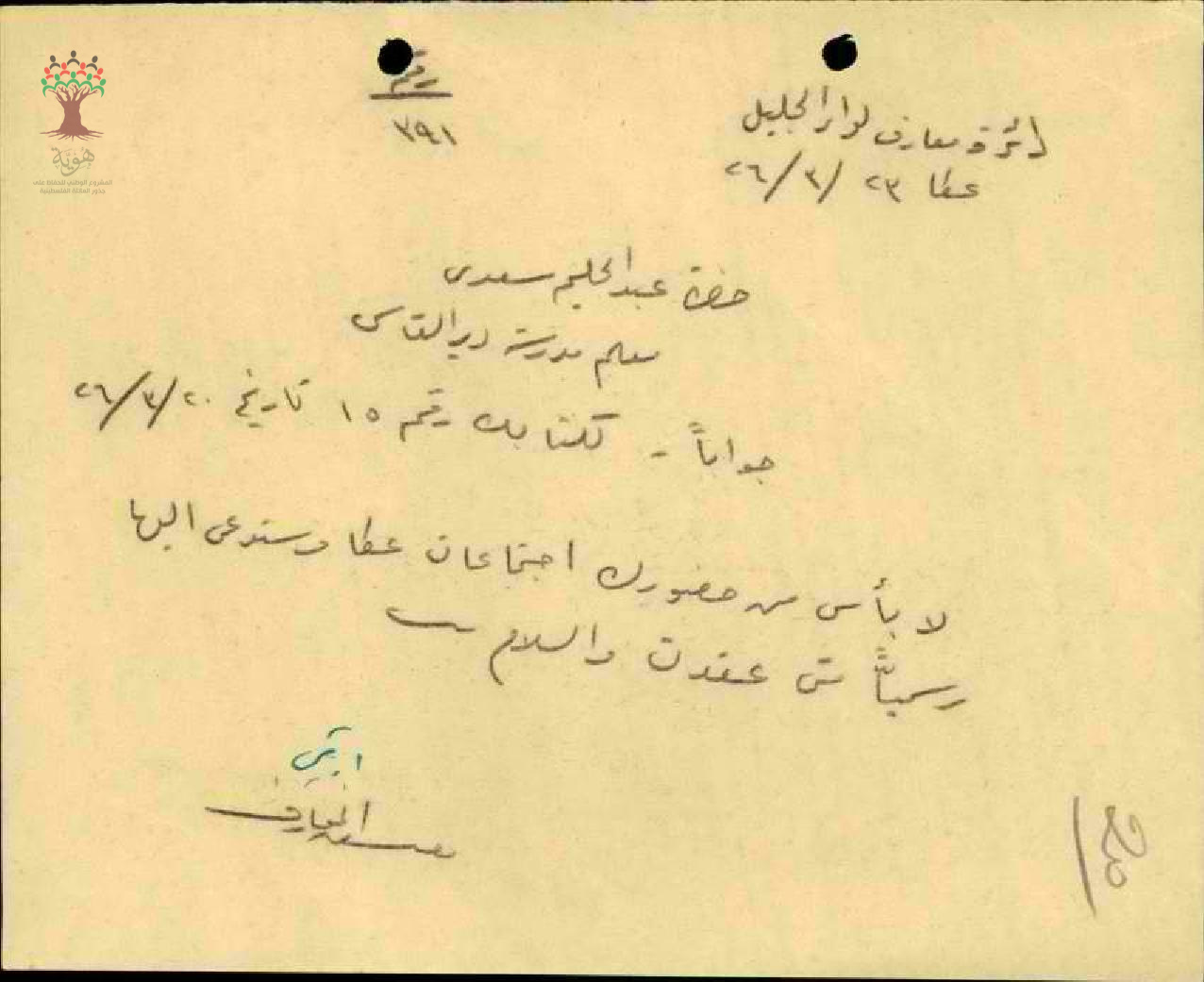 رسالة من مفتش المعارف الى المعلم عبد الحليم السعدي يخبره بانه سيتم دعوته رسميا الى الاجتماعات الشهرية
