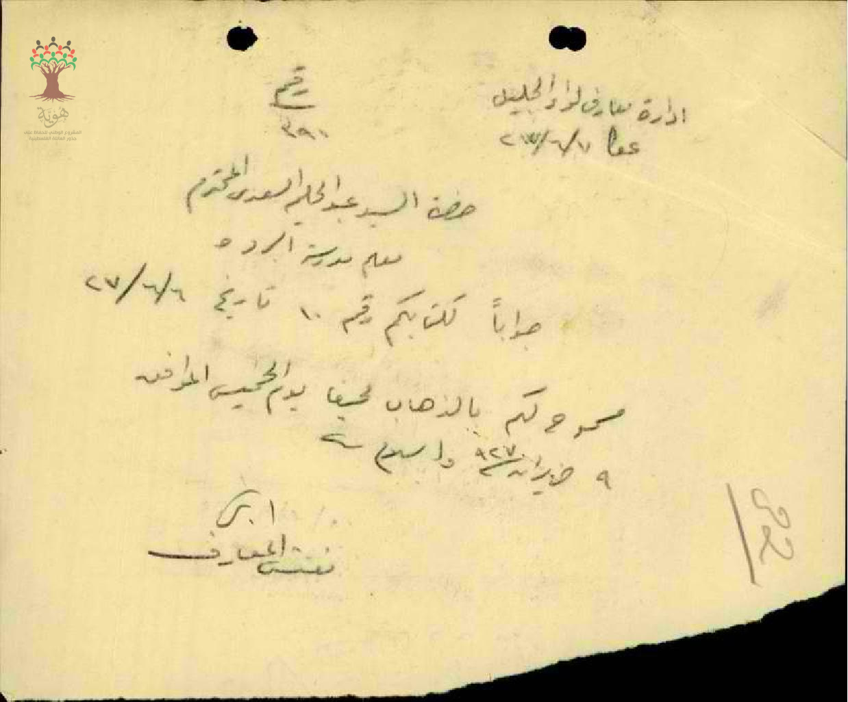 رسالة من مفتش المعارف الى المعلم عبد الحليم السعدي بخصوص الموافقة على ذهابه الى حيفا