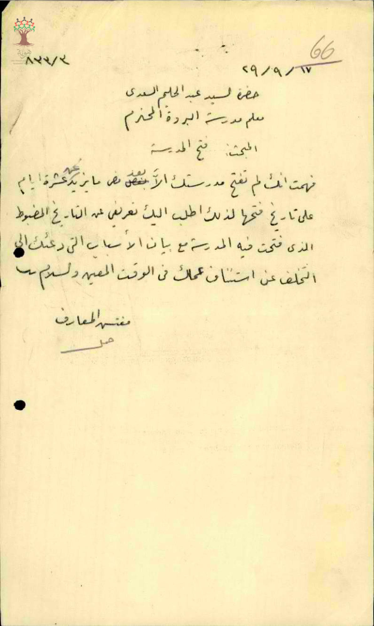 رسالة من مفتش المعارف الى المعلم عبد الحليم السعدي يسأله عن التأخر في فتح المدرسة مدة عشر ايام عن موعدها