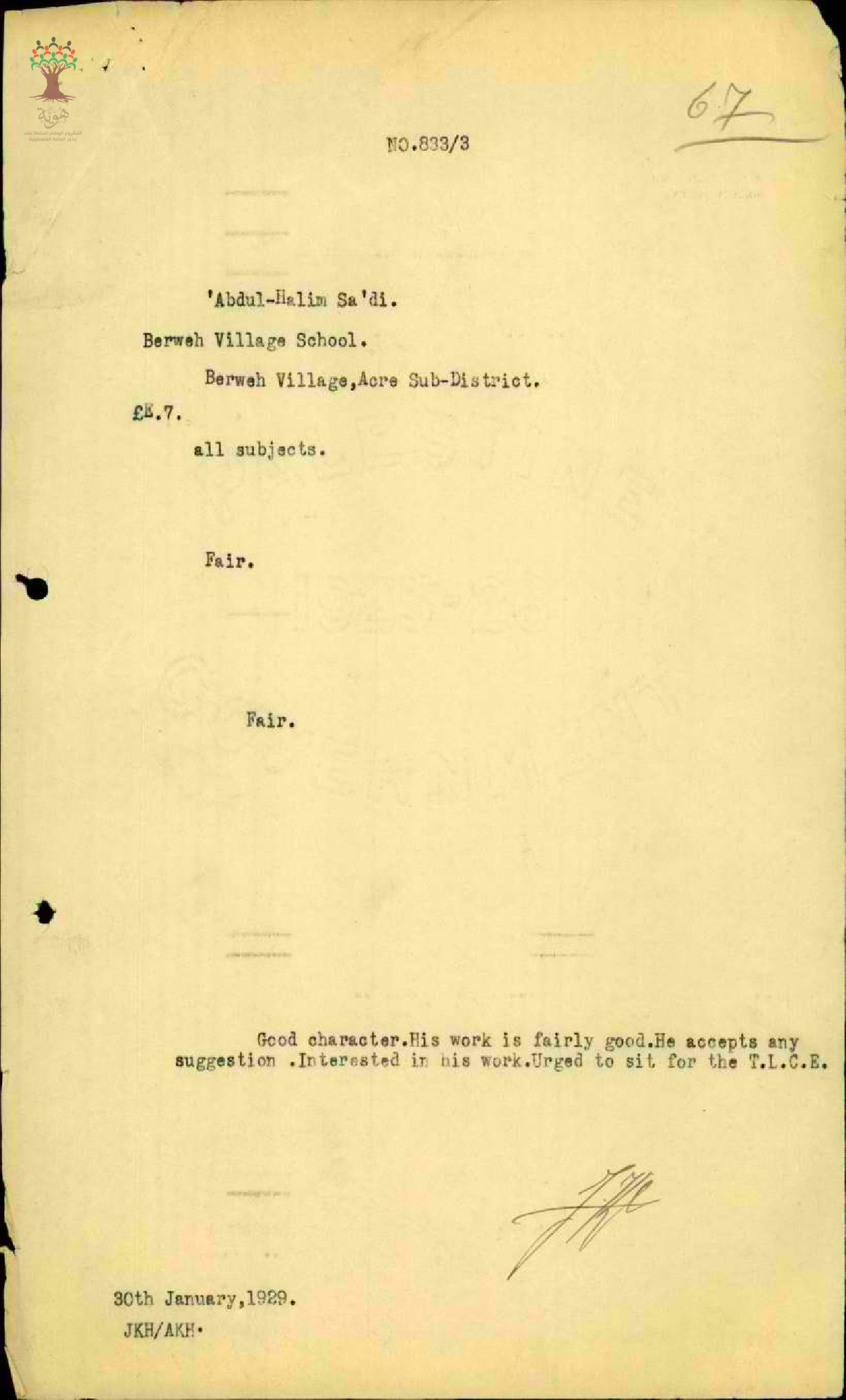 تقرير عن أداء المعلم عبد الحليم السعدي في مدرسة البروة سنة 1929