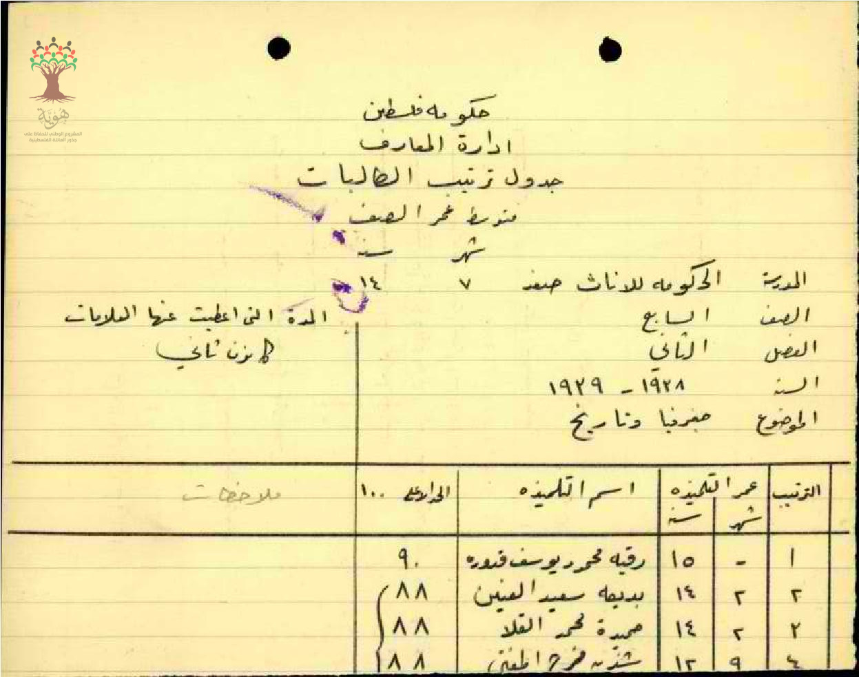 ترتيب الطلاب مدرسة الاناث الاميرية - مدرسة صفد - الصف السابع