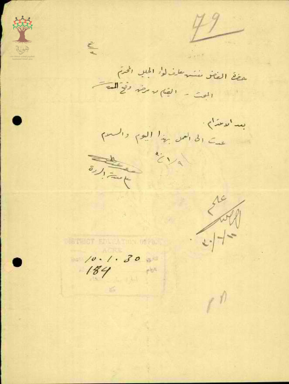رسالة من المعلم عبد الحليم السعدي الى مفتش المعارف بخصوص عودته الى العمل