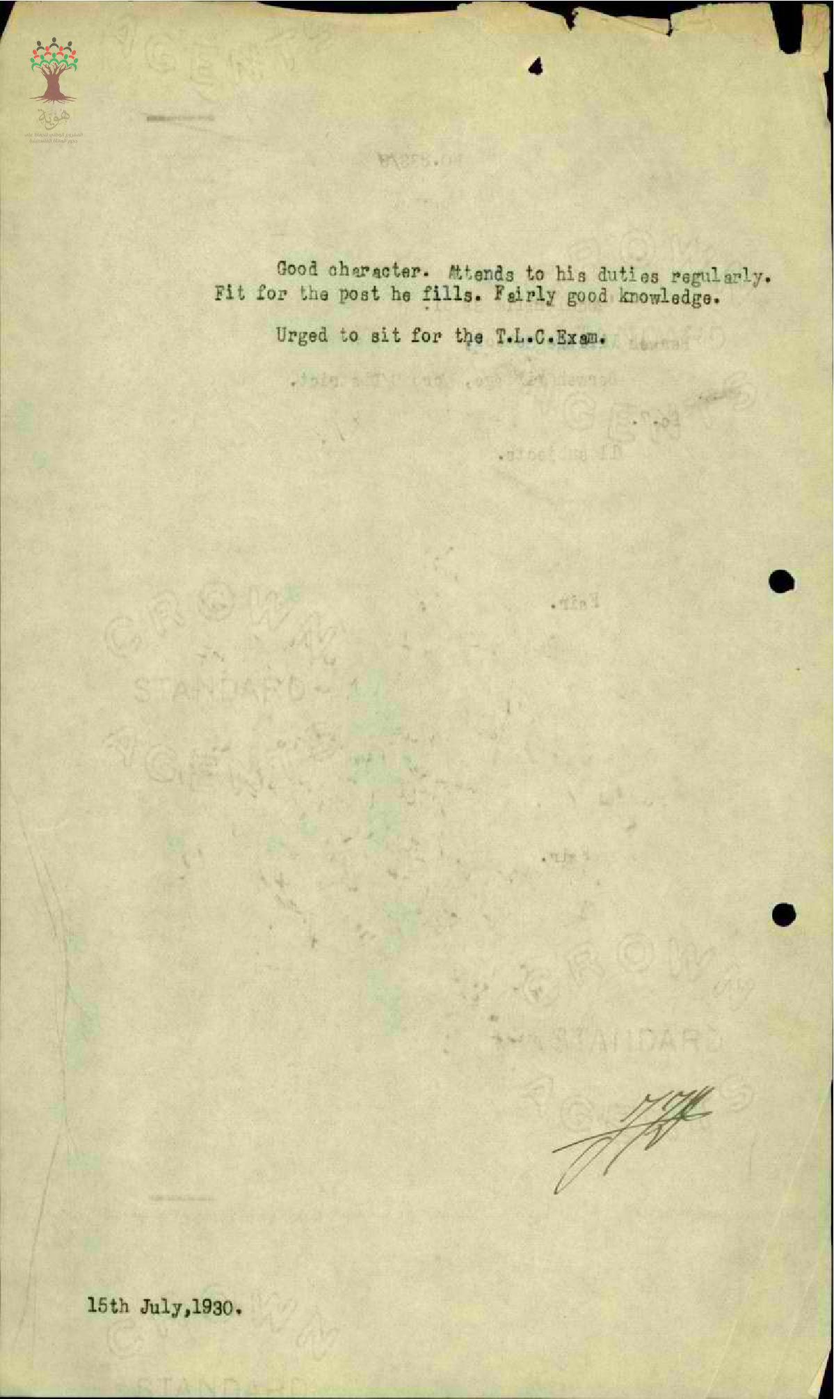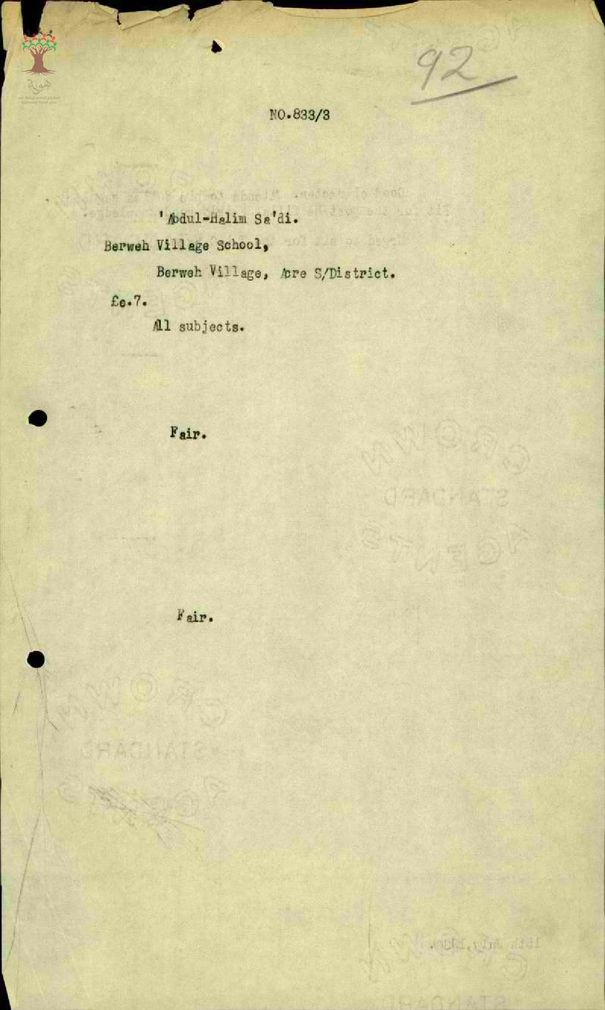 تقرير تفصيلي عن أداء المعلم عبد الحليم السعدي في مدرسة البروة سنة 1930