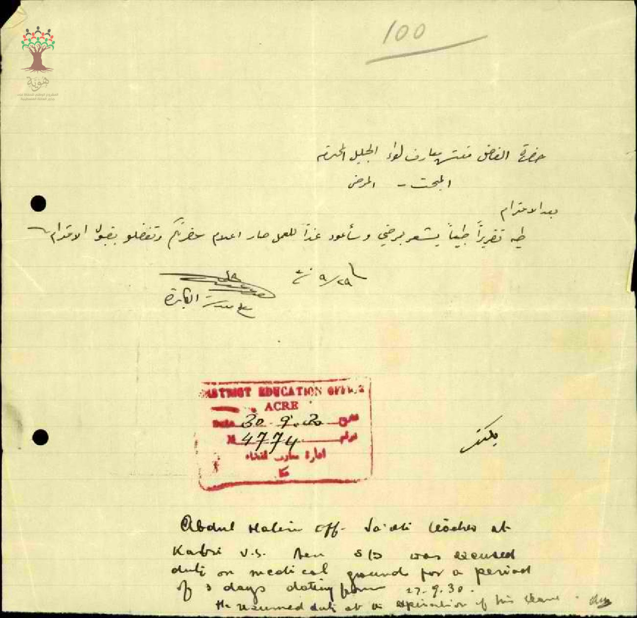 رسالة من المعلم عبد الحليم السعدي الى مفتش المعارف بخصوص تغيبه عن المدرسة مرفقة بالتقرير الطبي