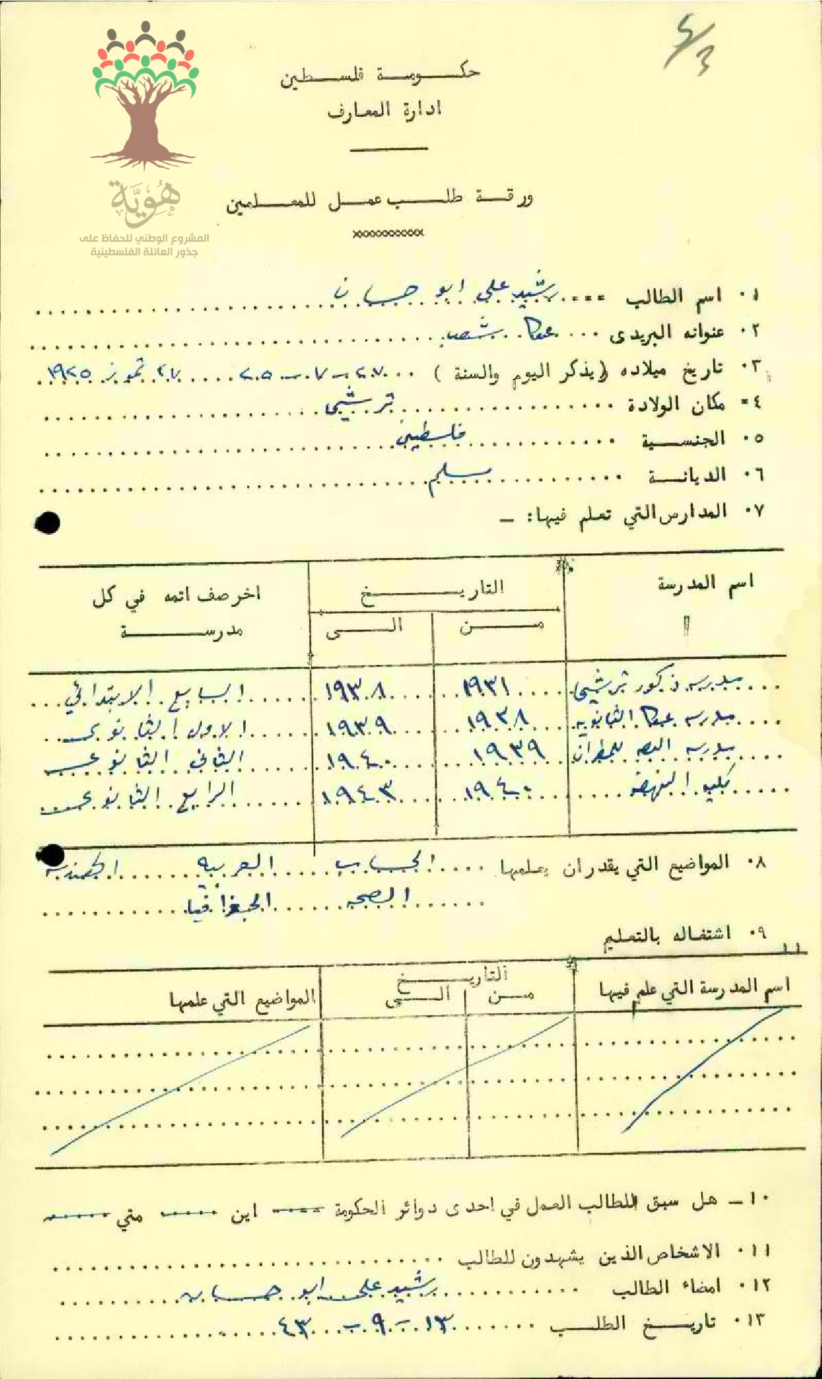 طلب توظيف مقدم من المعلم رشيد ابو حسان مواليد 27/5/1925 - ترشيحا - مدرسة شعب