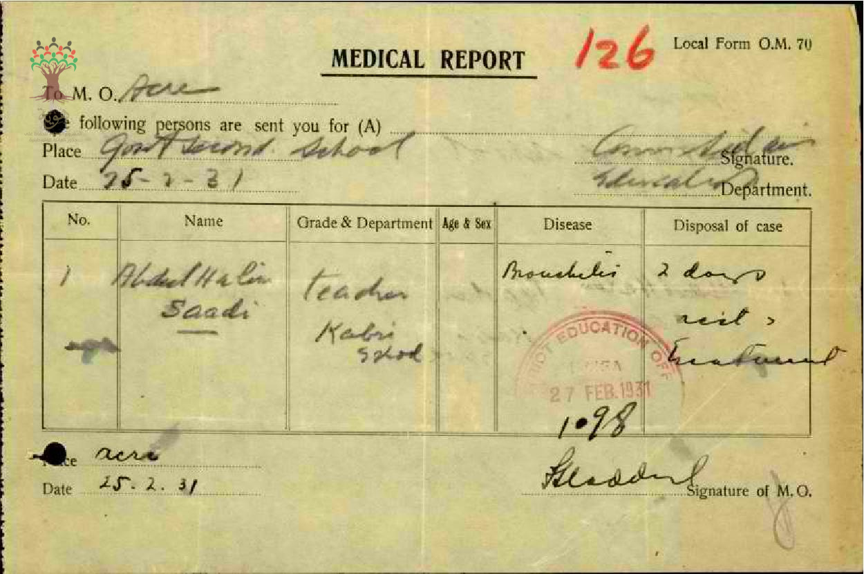 تقرير طبي عن غياب المعلم عبد الحليم السعدي-مدرسة الكابري