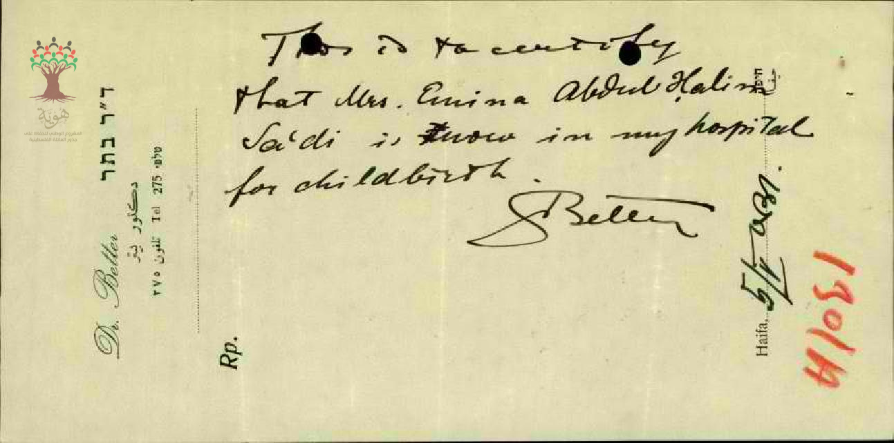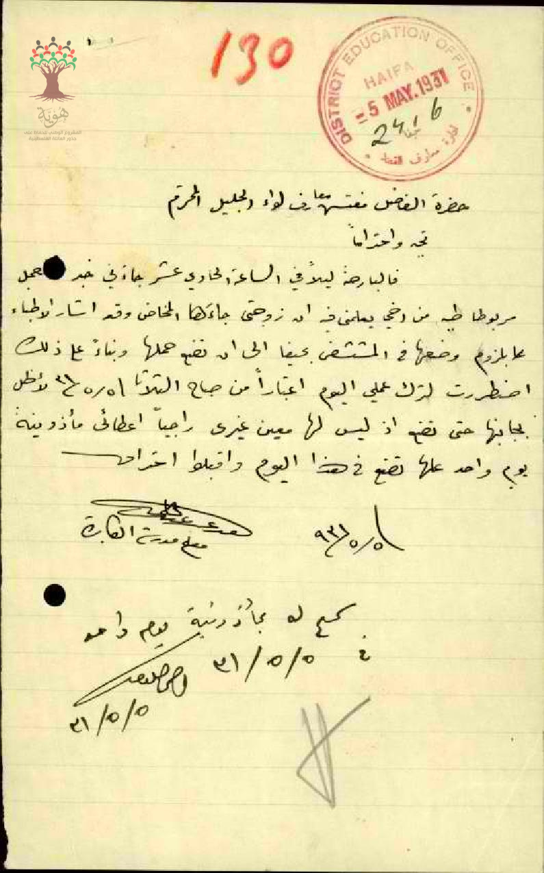 رسالة من المعلم عبد الحليم السعدي الى مفتش المعارف بخصوص تغيبه عن المدرسة بسبب ولادة زوجته مرفقة بالتقرير الطبي