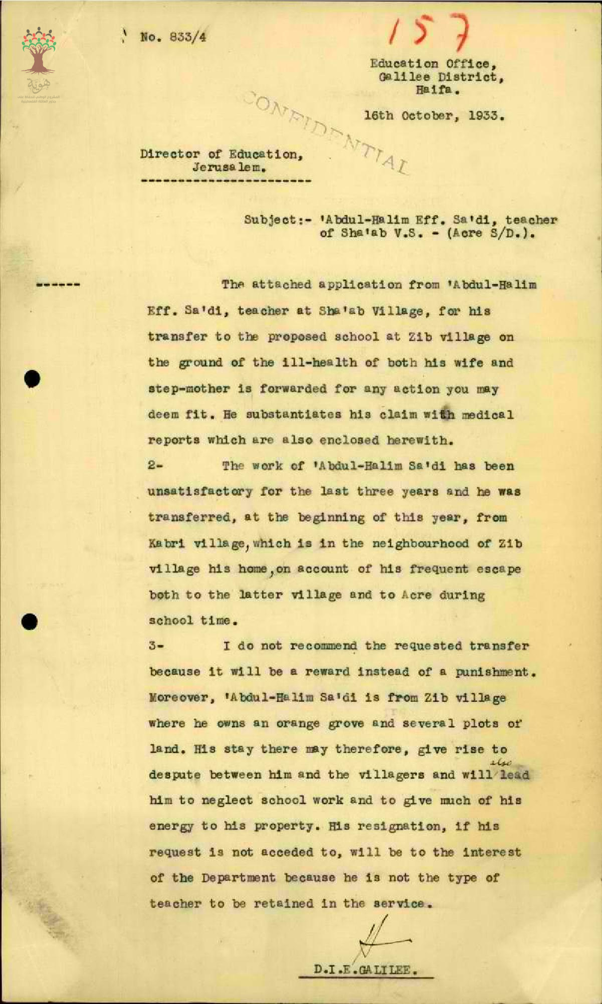 رسالة من مفتش المعارف الى مدير المعارف ينقل فيها رغبة المعلم عبد الحليم السعدي بالانتقال من مدرسة شعب الى مدرسة الزيب