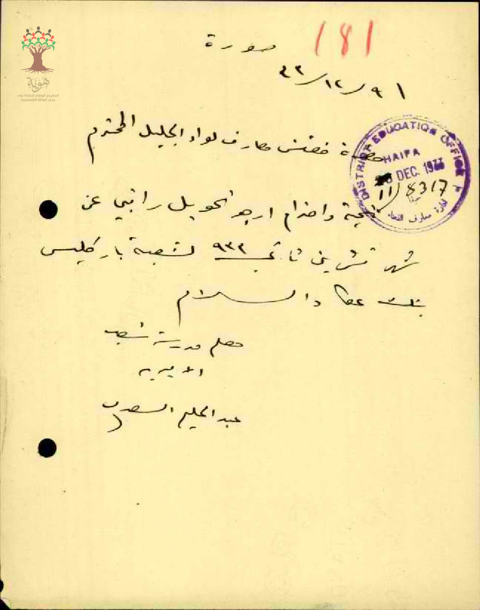 رسالة من المعلم عبد الحليم السعدي الى مفتش المعارف يطلب تحويل راتبه