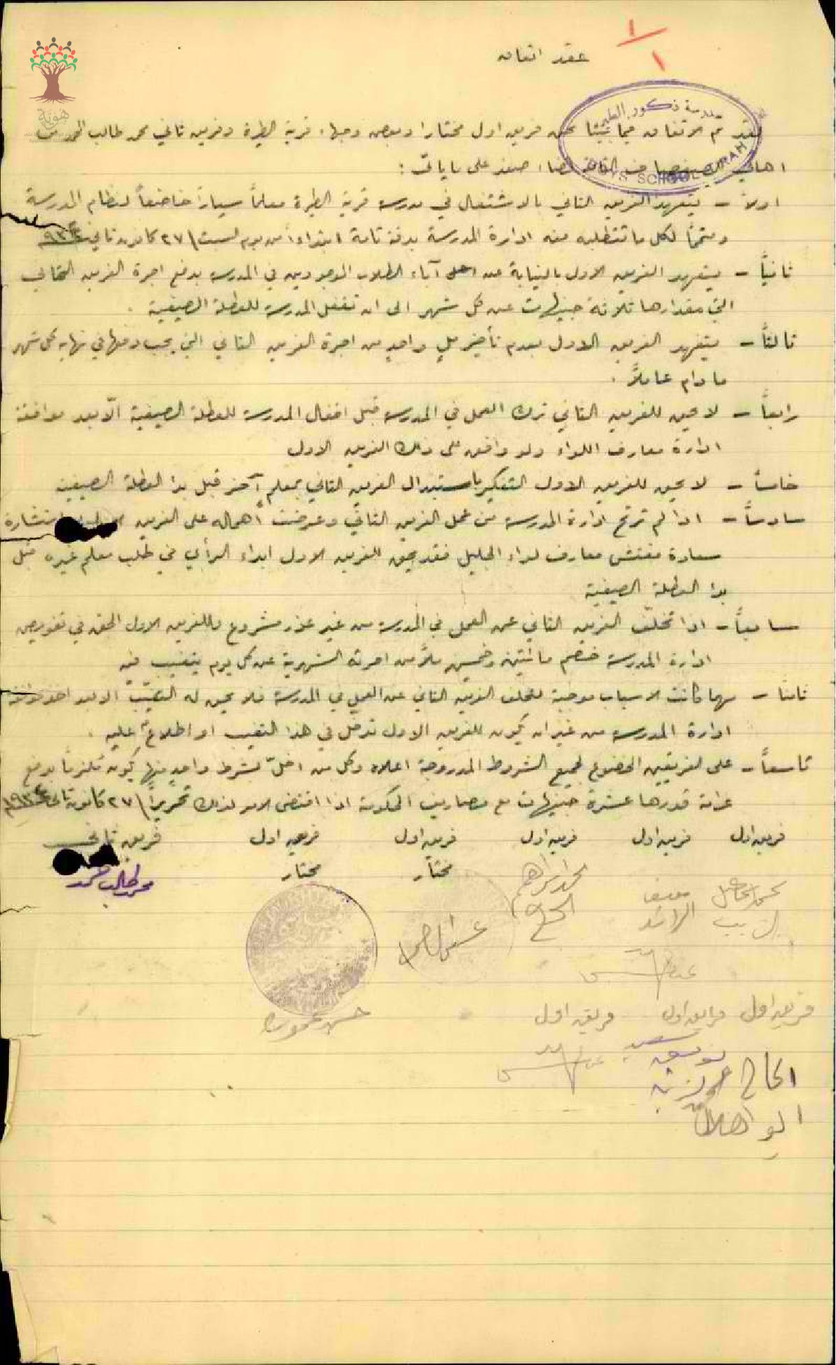 عقد اتفاق بين مخاتير ووجهاء قرية الطيرة والمعلم محمد طالب حمد على شروط تعيينه معلما سيارا في مدرسة القرية