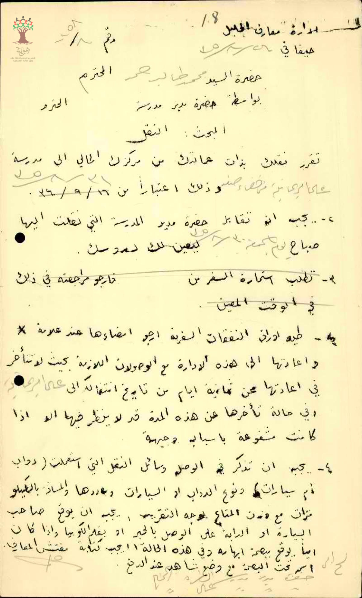 رسالة من مفتش المعارف الى المعلم محمد حمد بخصوص الموافقة على نقله من طبريا الى علما الريحانية