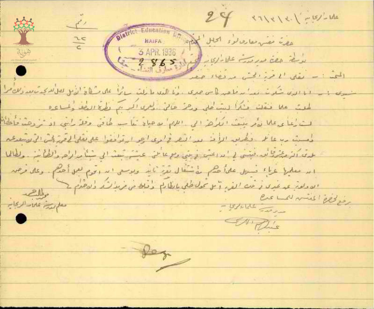 رسالة من المعلم محمد حمد الى مفتش المعارف يطلب فيها نقله من مدرسة علما الى الجش