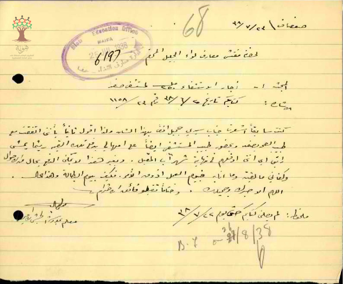 رسالة من المعلم محمد حمد الى مفتش المعارف بخصوص دفع تكاليف المستشفى