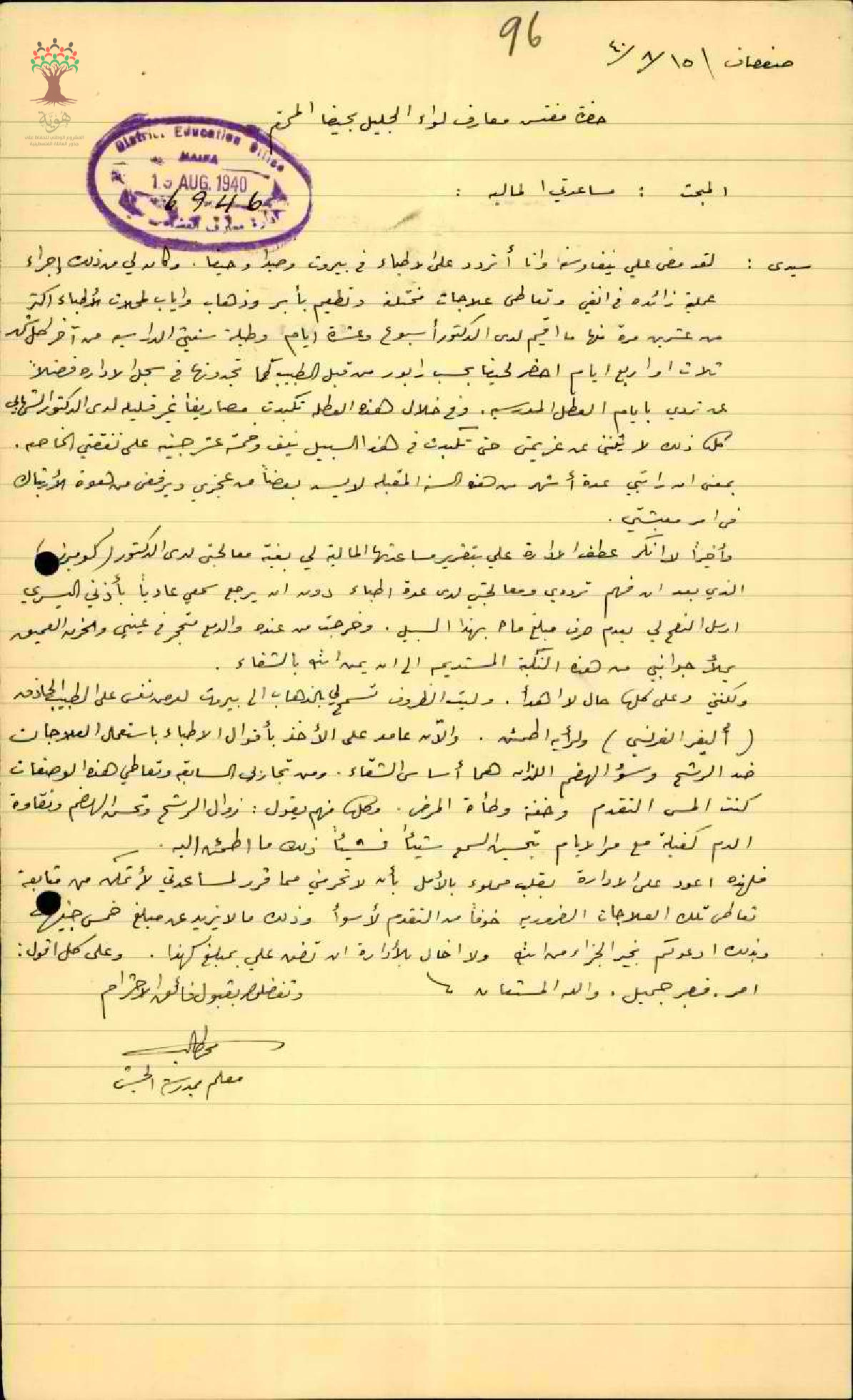 رسالة من المعلم محمد حمد الى مفتش المعارف بخصوص تقديم المساعدة المالية لعلاجه
