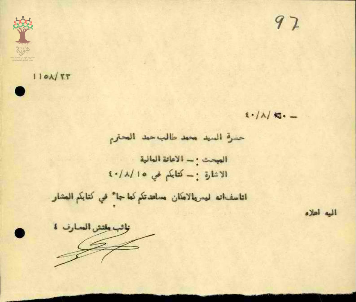 رسالة من نائب مدير المعارف الى المعلم محمد حمد بخصوص عدم امكانية تقديم مساعدة مالية له