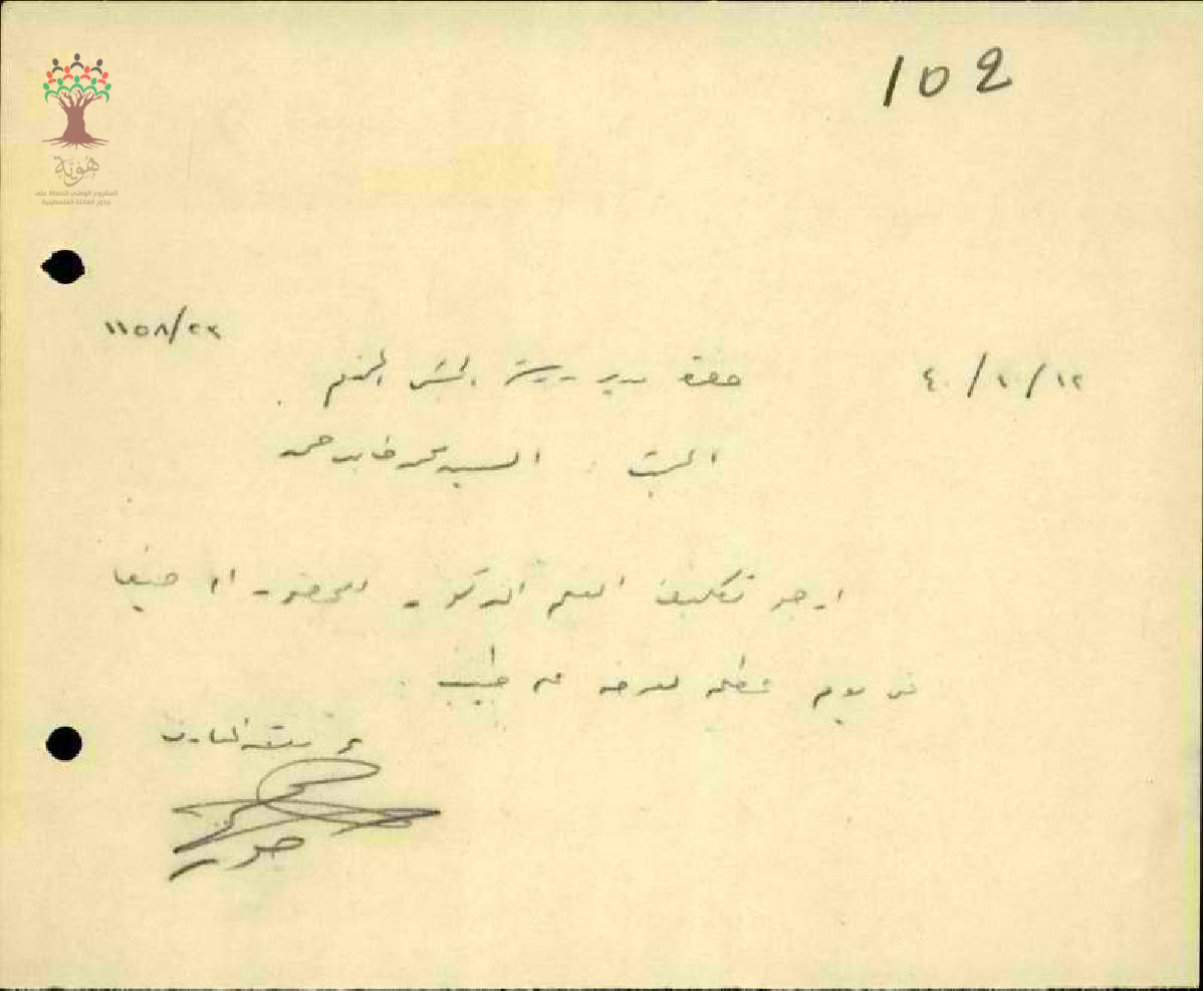رسالة من مفتش المعارف الى مدير مدرسة الجش يطلب حضور المعلم محمد حمد الى حيفا