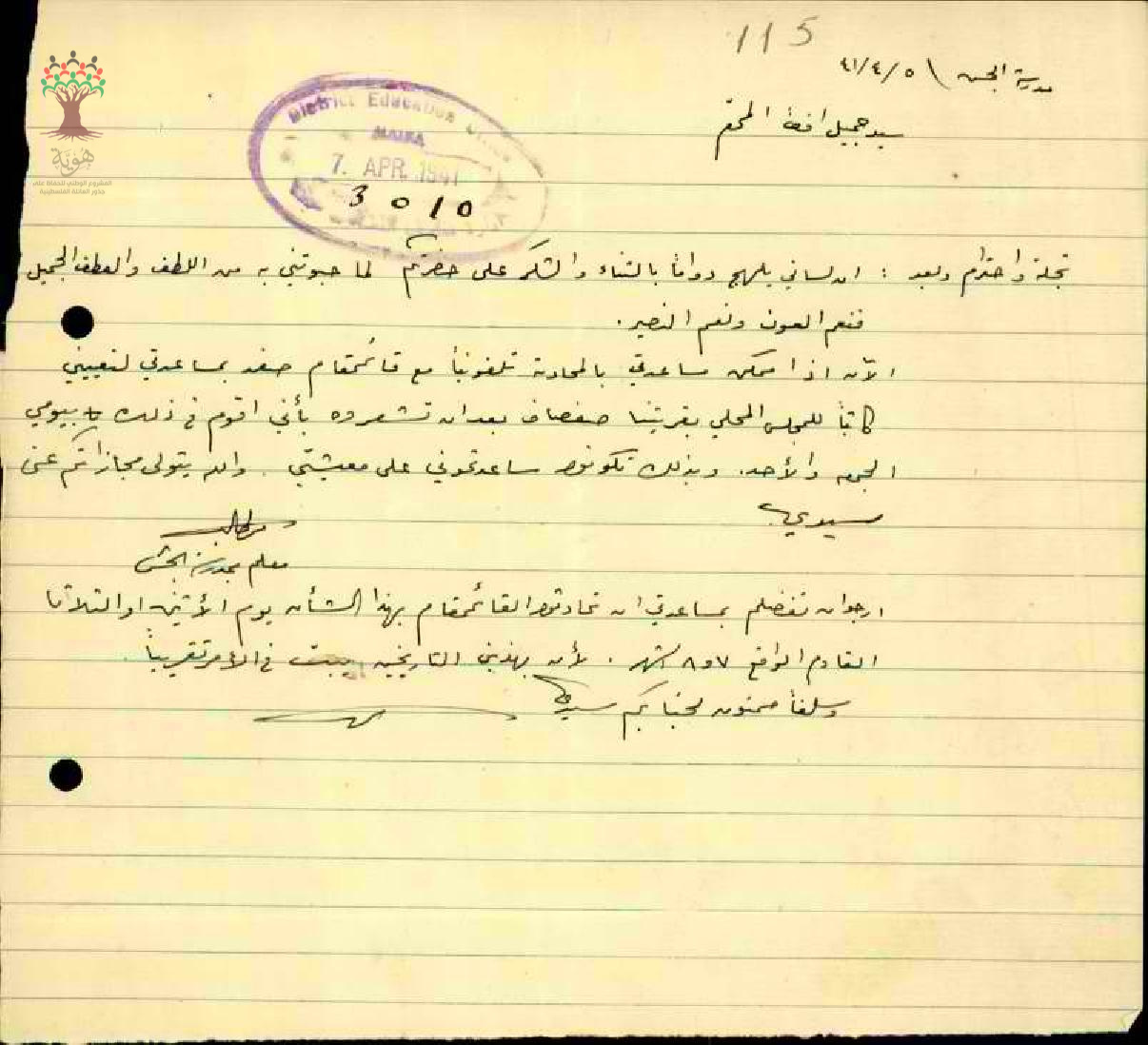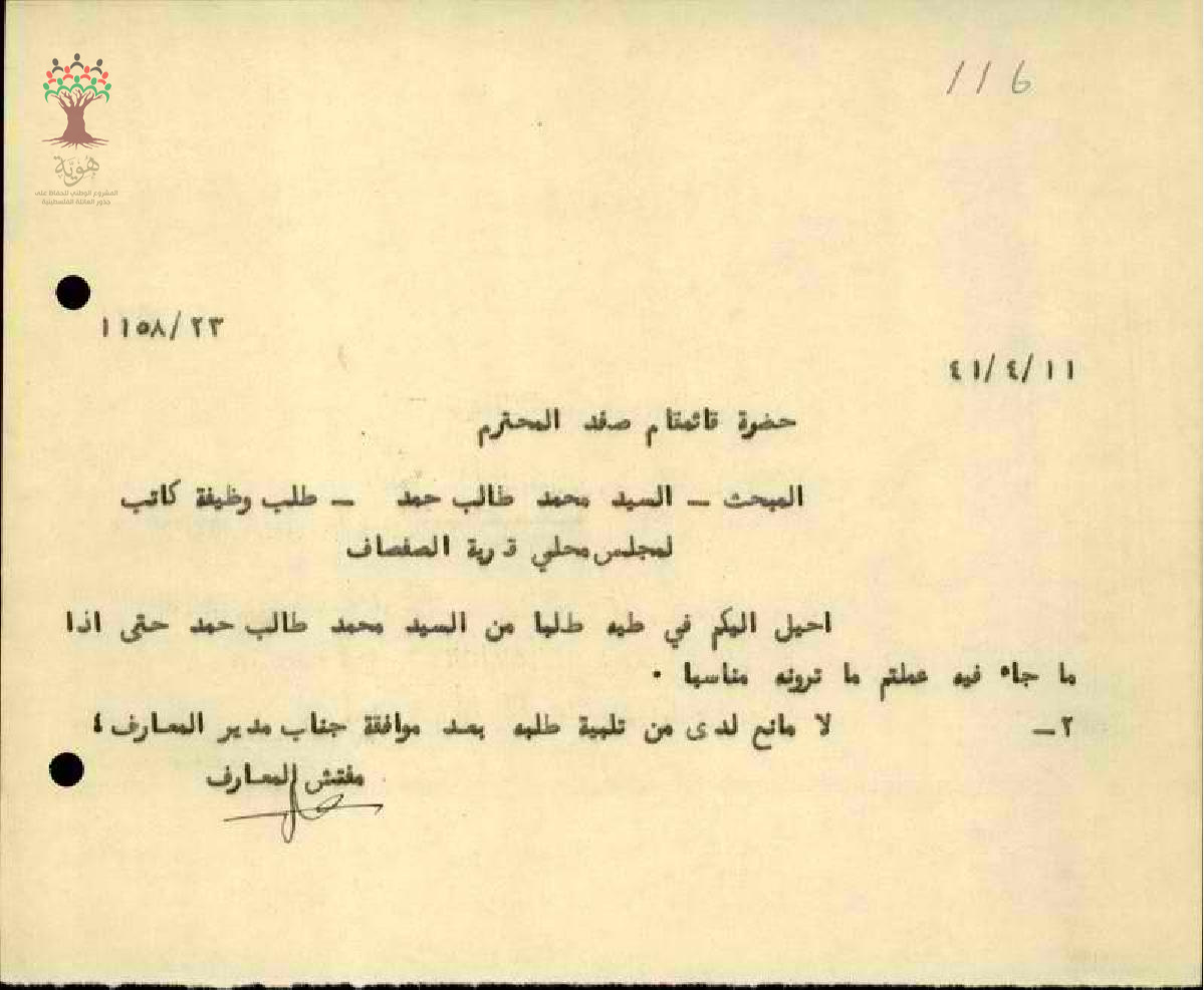 رسالة من مفتش المعارف الى مدير المعارف مرفقة بطلب المعلم محمد حمد تعيينه ككاتب للمجلس المحلي في الصفصاف