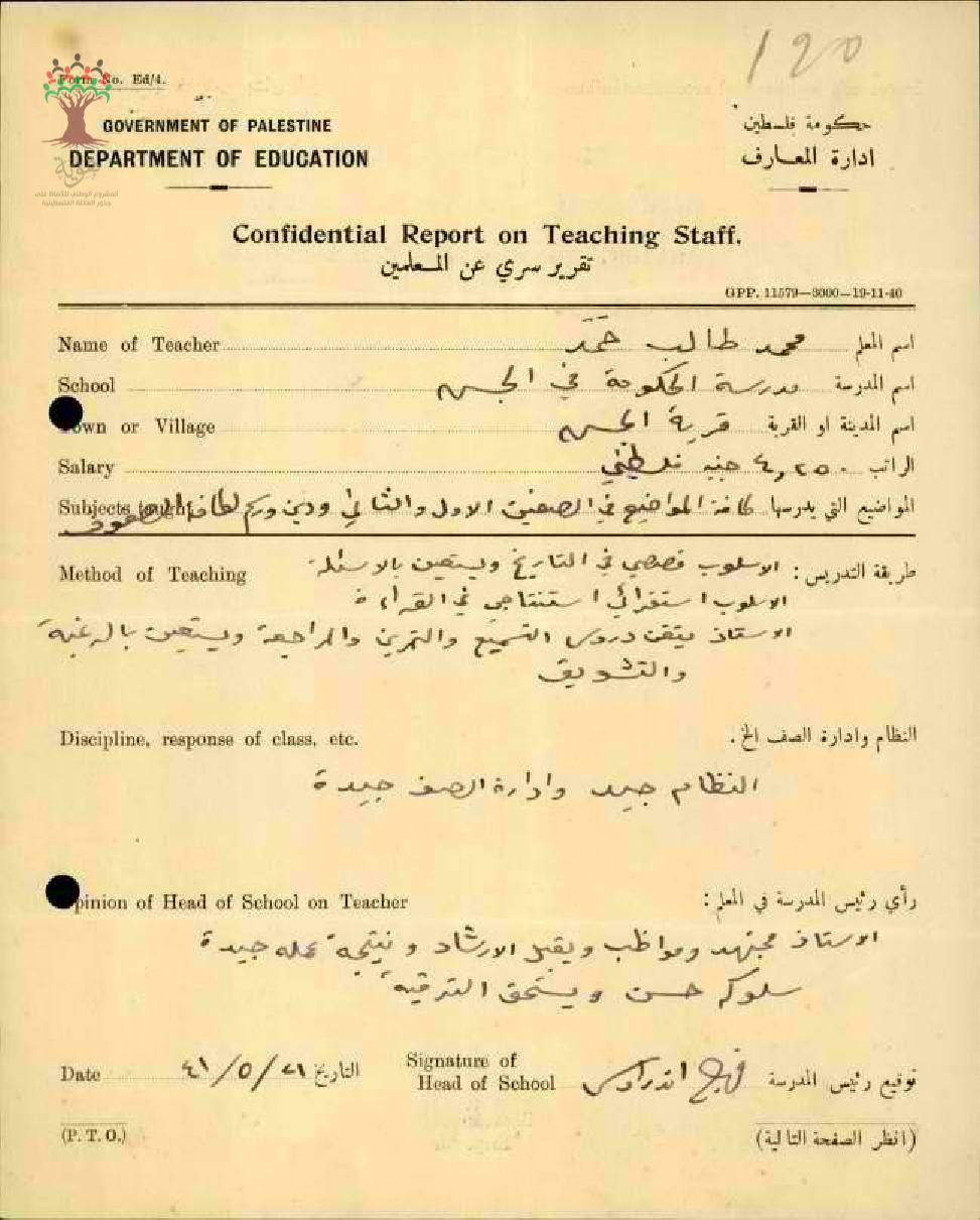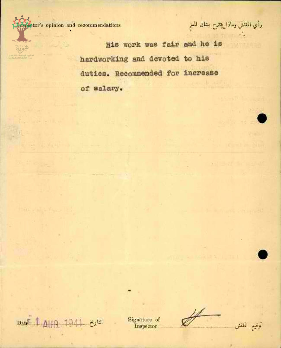 تقرير تفصيلي عن أداء المعلم محمد طالب حمد في مدرسة الجش سنة 1941