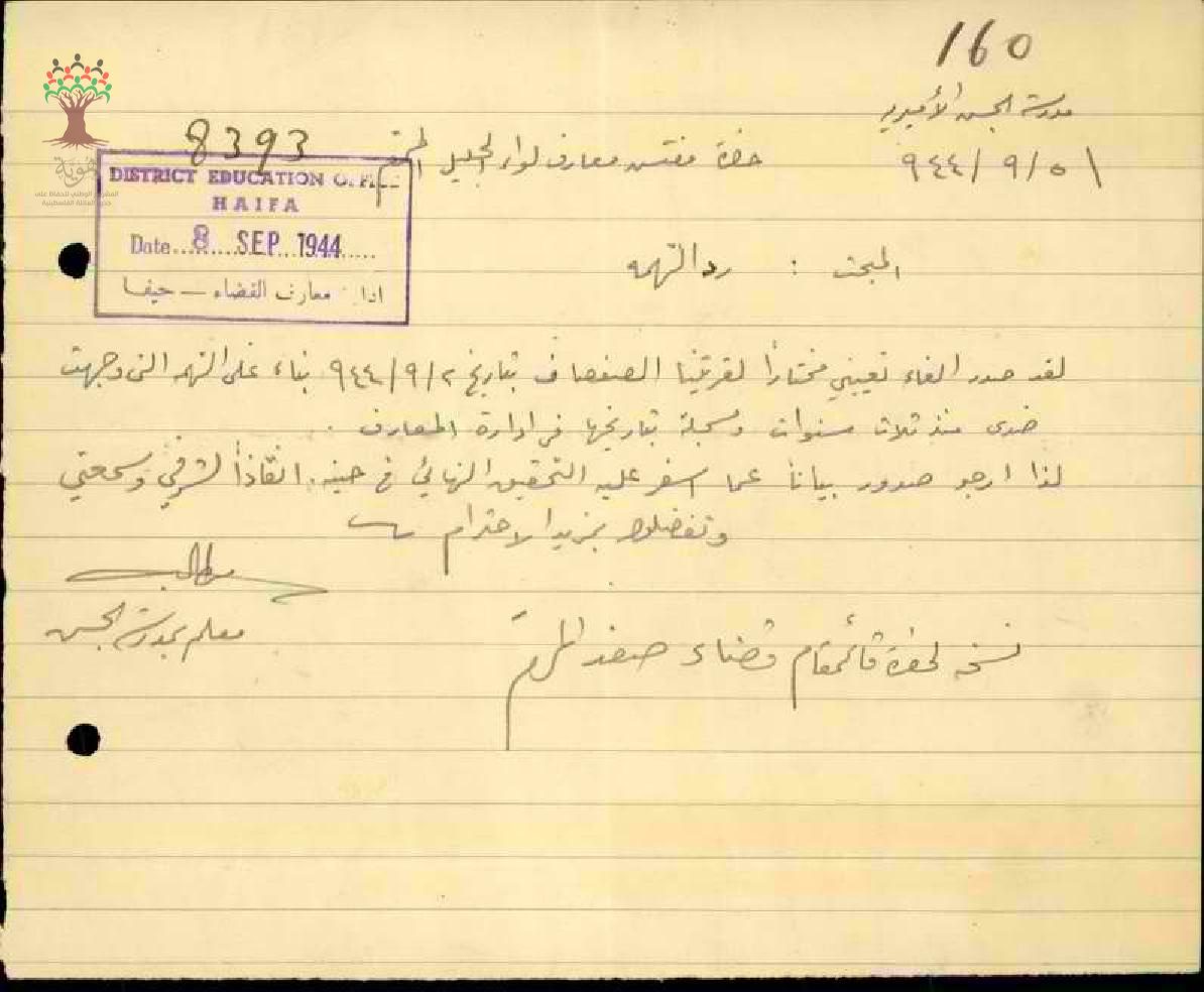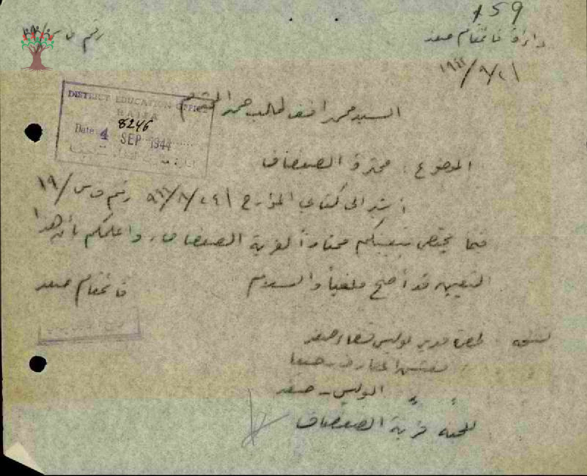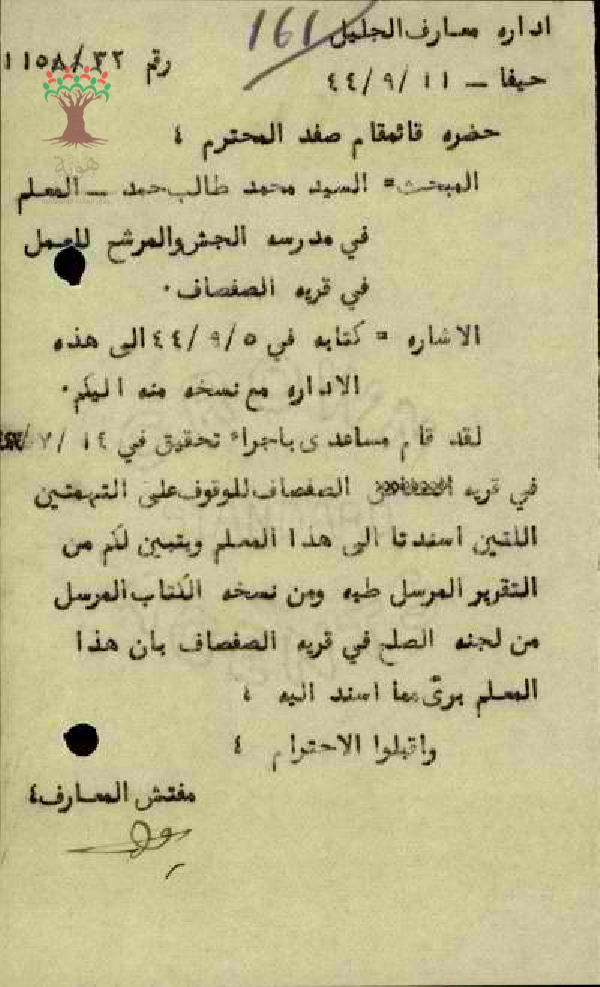مجموعة رسائل بخصوص الغاء تعيين المعلم محمد حمد كمختار لقرية الصفصاف نظرا للتهم الموجهة اليه وبيان عدم صحتها بعد التحقيق