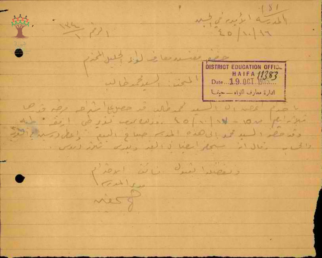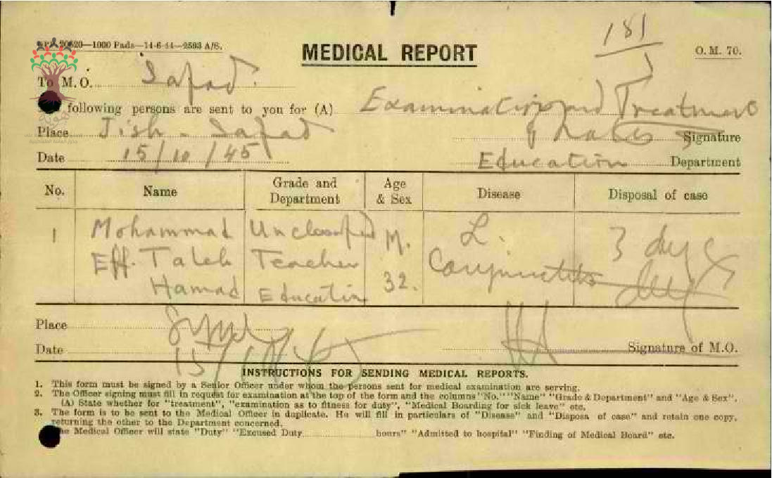 رسالة من مدير مدرسة الجش الى مفتش المعارف بخصوص تغيب المعلم محمد حمد مرفقة بالتقرير الطبي