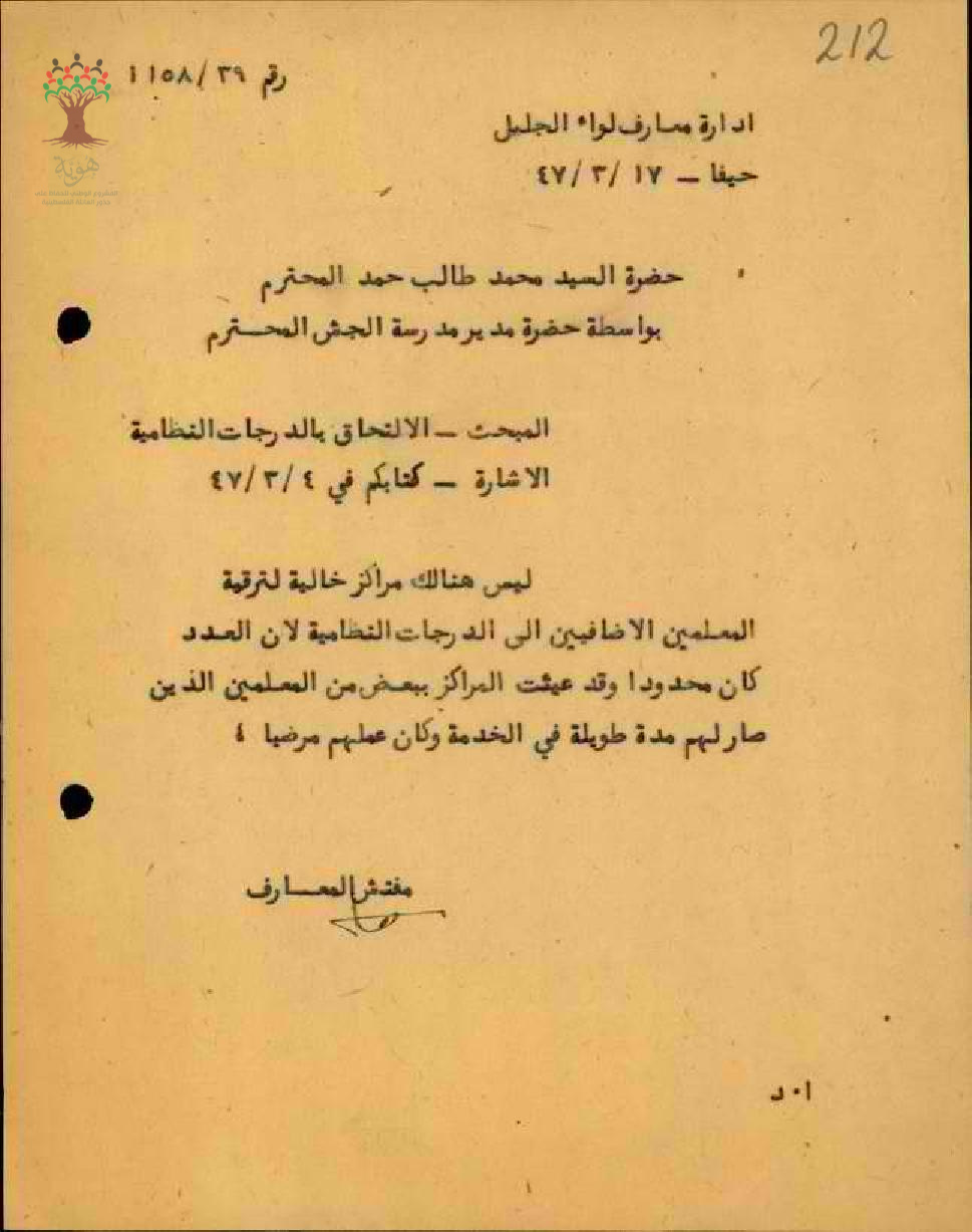 رسالة من مفتش المعارف الى المعلم محمد حمد يخبره بعدم امكانية الحاقه بالدرجات النظامية