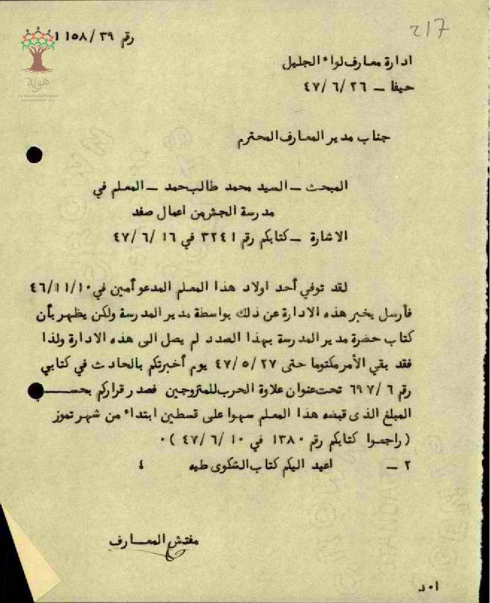رسالة من مفتش المعارف الى مدير المعارف بخصوص وفاة احد أولاد المعلم محمد حمد
