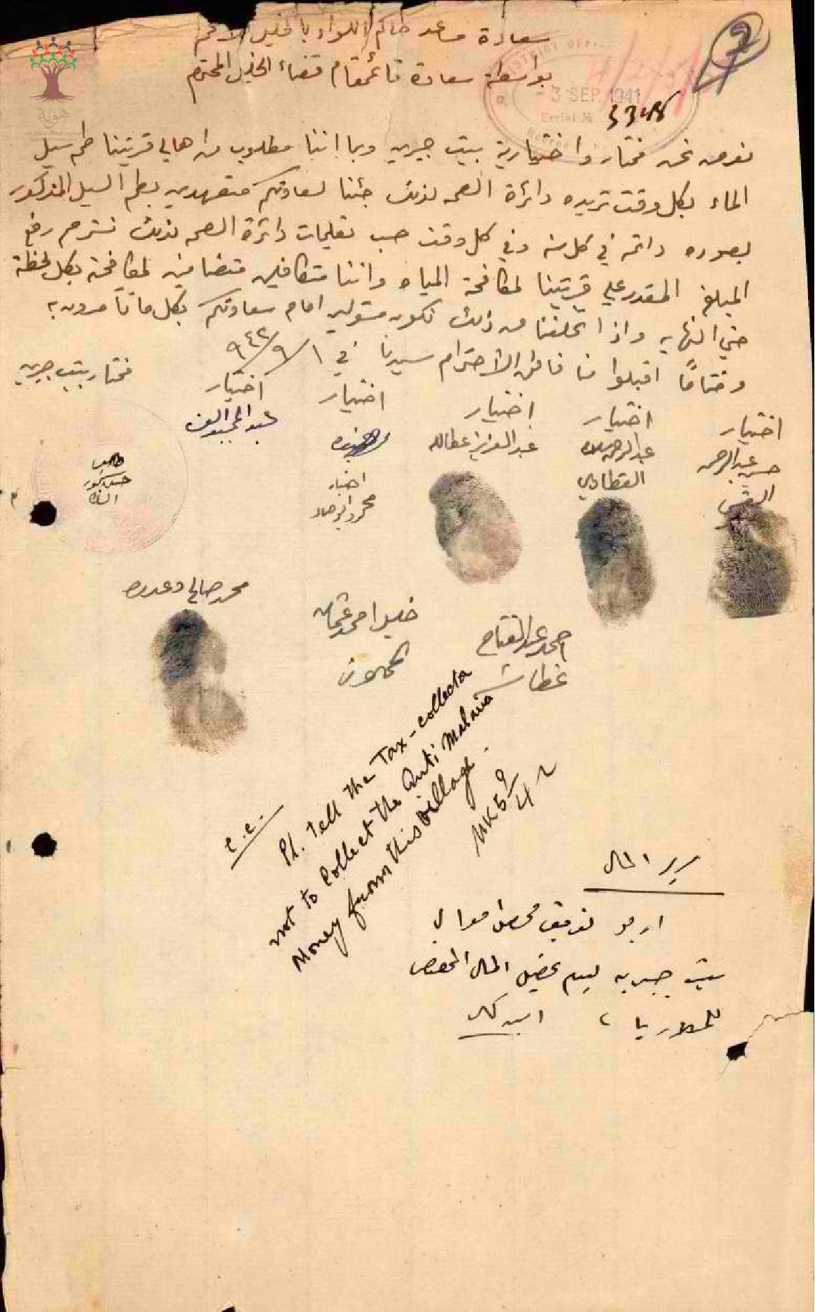 رسالة من مختار قرية بيت جبرين إلى مساعد حاكم لواء الخليل بخصوص طمر سيل الماء