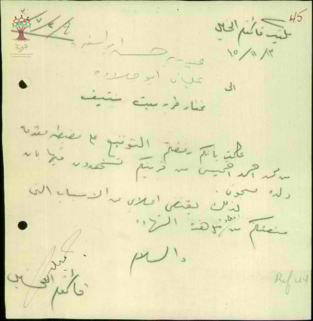 رسالة من قائمقام قضاء الخليل إلى مختار قرية بيت نتيف بخصوص محمد أحمد اخميس