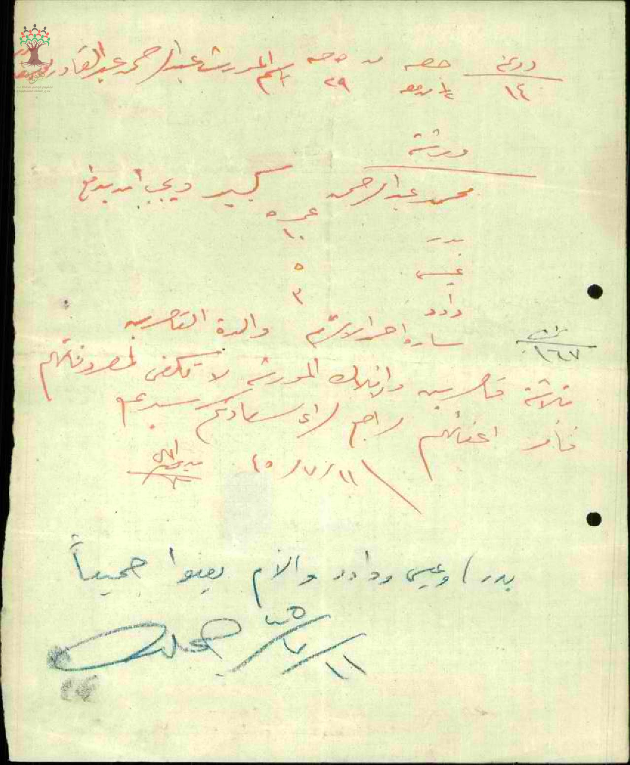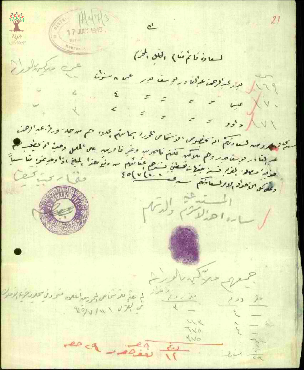رسالة من محمد عبد الرحمن عبد القادر يوسف بدر إلى قائمقام قضاء الخليل يطلب اعفاء زوجته من دفع ضريبة مصلحة القرية