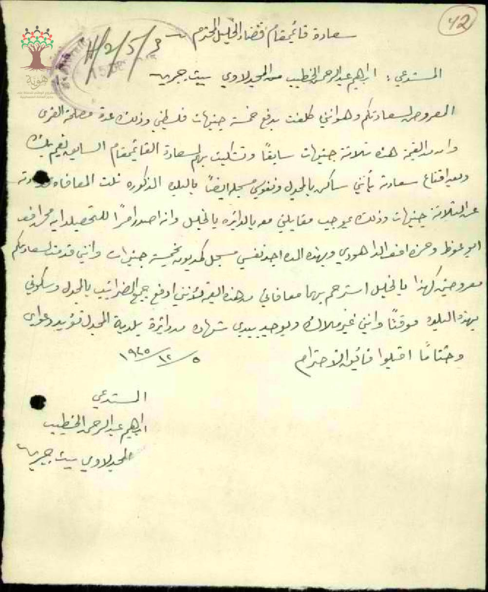 رسالة من ابراهيم عبد الرحمن الخطيب المجدلاوي من بيت دجن إلى قائمقام قضاء الخليل