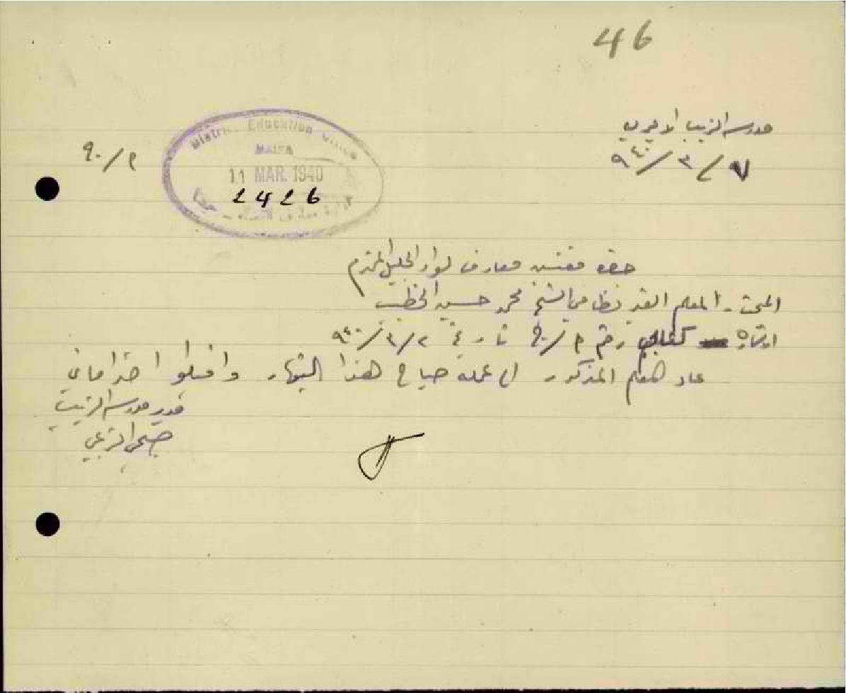رسالة من مدير مدرسة الزيب الى مفتش المعارف يخبره بأن المعلم محمد الخطيب قد عاد عمله