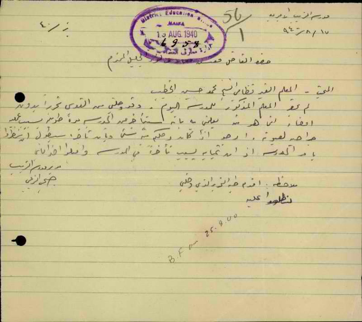 رسالة من مدير مدرسة الزيب الى مفتش المعارف بخصوص تغيب المعلم محمد الخطيب