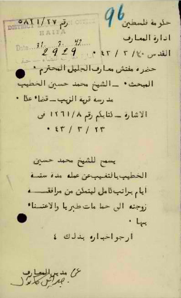 رسالة من مدير المعارف الى مفتش المعارف يوافق على اعطاء المعلم محمد الخطيب اجازة لمدة ستة أيام لمرافقة زوجته المريضة