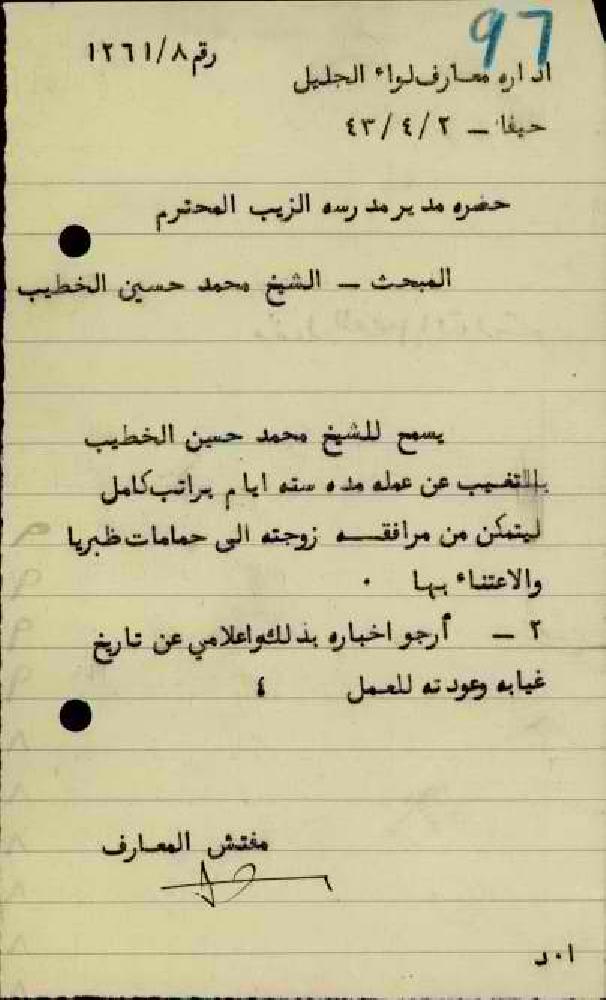 رسالة من مفتش المعارف الى مدير مدرسة الزيب يوافق على اعطاء المعلم محمد الخطيب اجازة لمدة ستة أيام لمرافقة زوجته المريضة