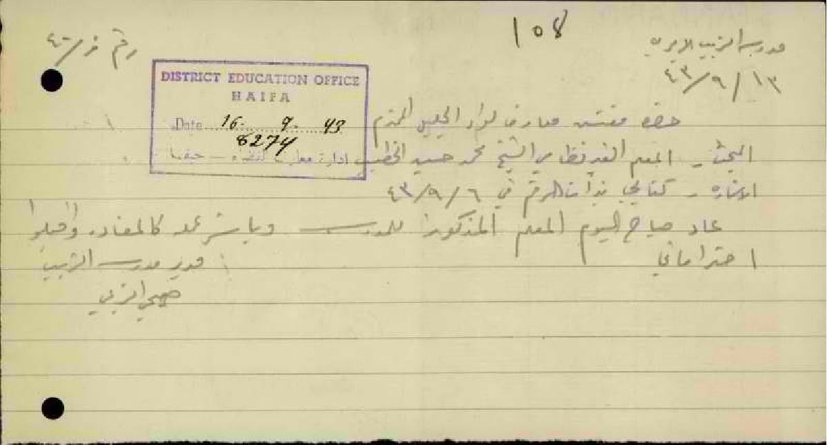 رسالة من مدير مدرسة الزيب الى مفتش المعارف يخبره بأن المعلم محمد الخطيب قد عاد الى عمله