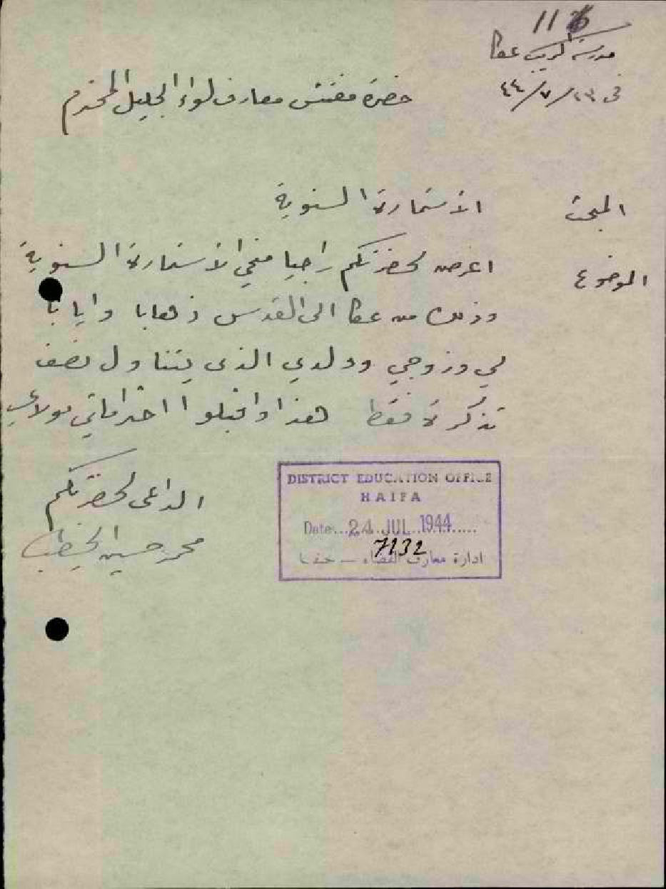 رسالة من المعلم محمد الخطيب الى مفتش المعارف بخصوص استمارة سفره السنوية