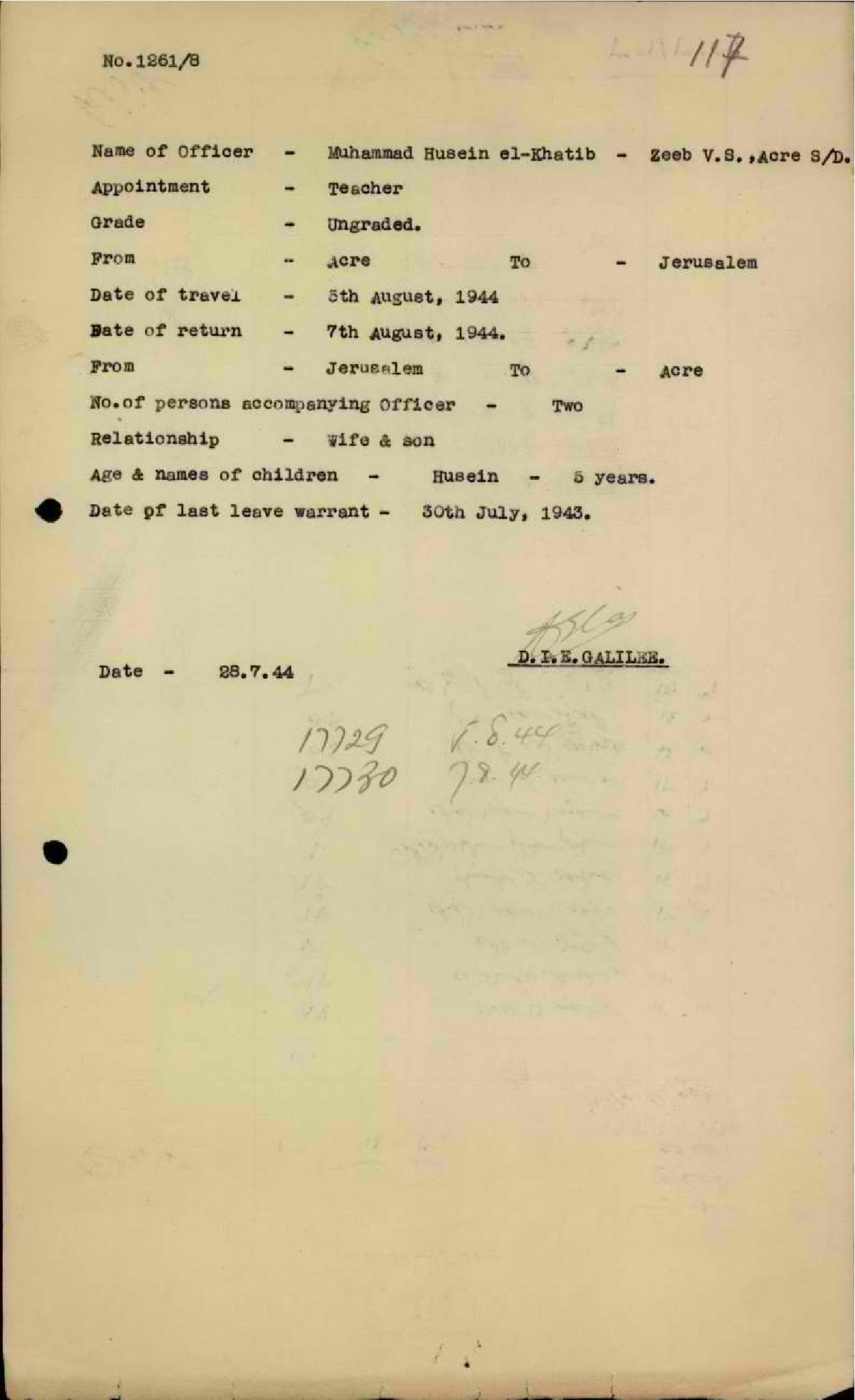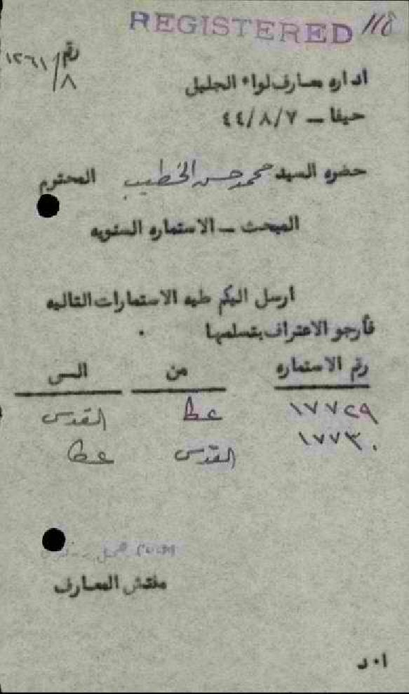 رسالة من مفتش المعارف الى المعلم محمد الخطيب مرفقة باستمارة سفره السنوية