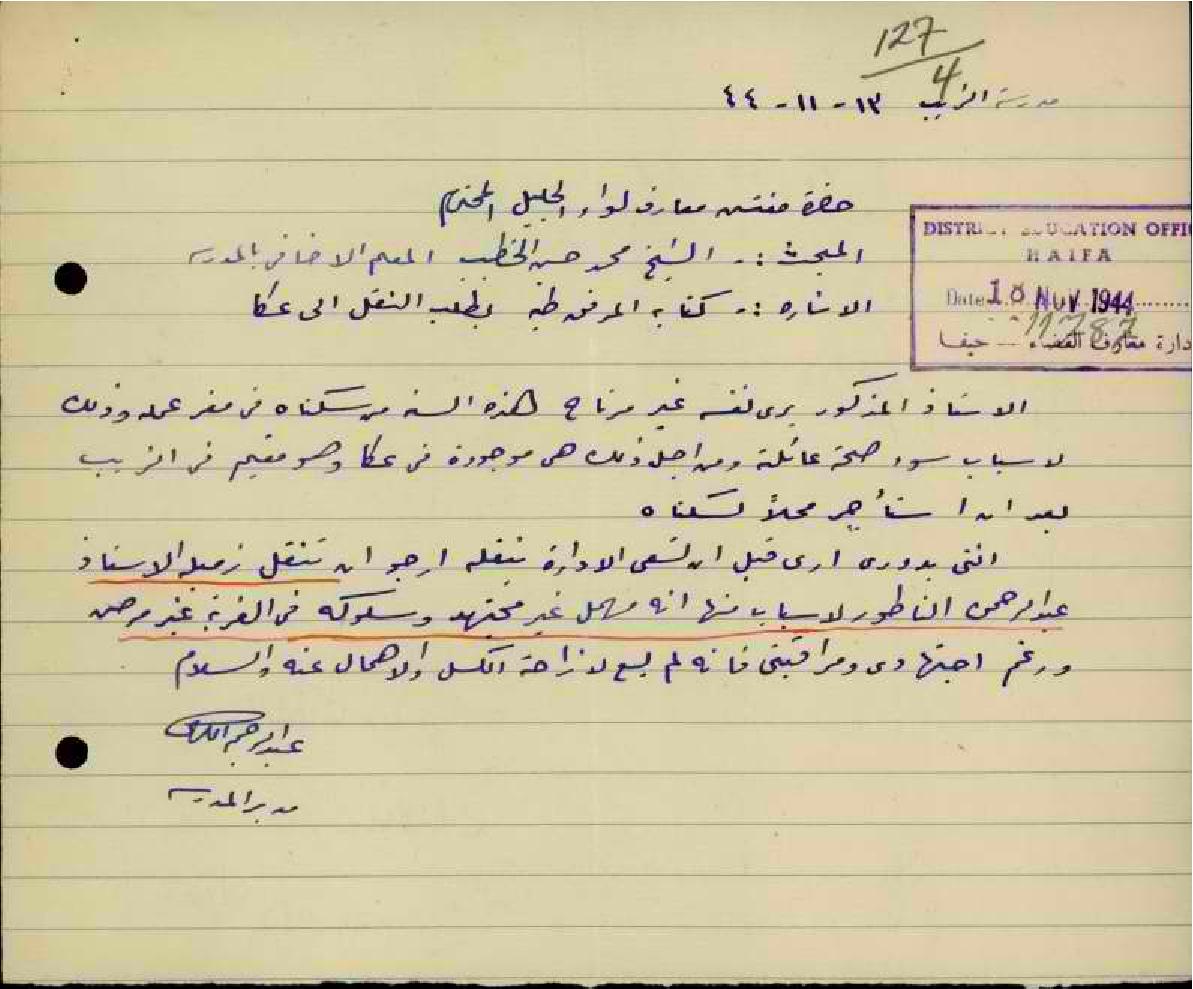 رسالة من مدير مدرسة الزيب الى مفتش المعارف بخصوص طلب المعلم محمد الخطيب بنقله الى عكا