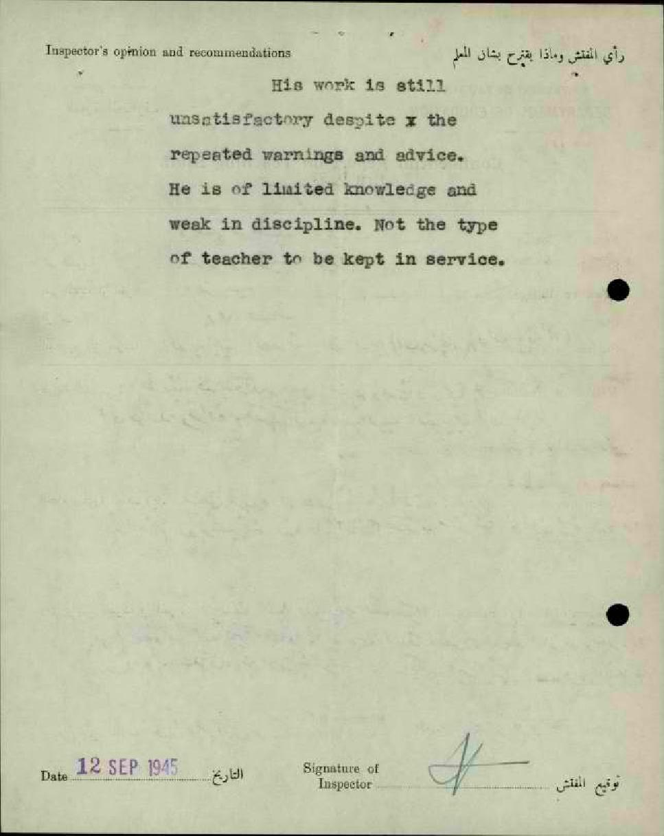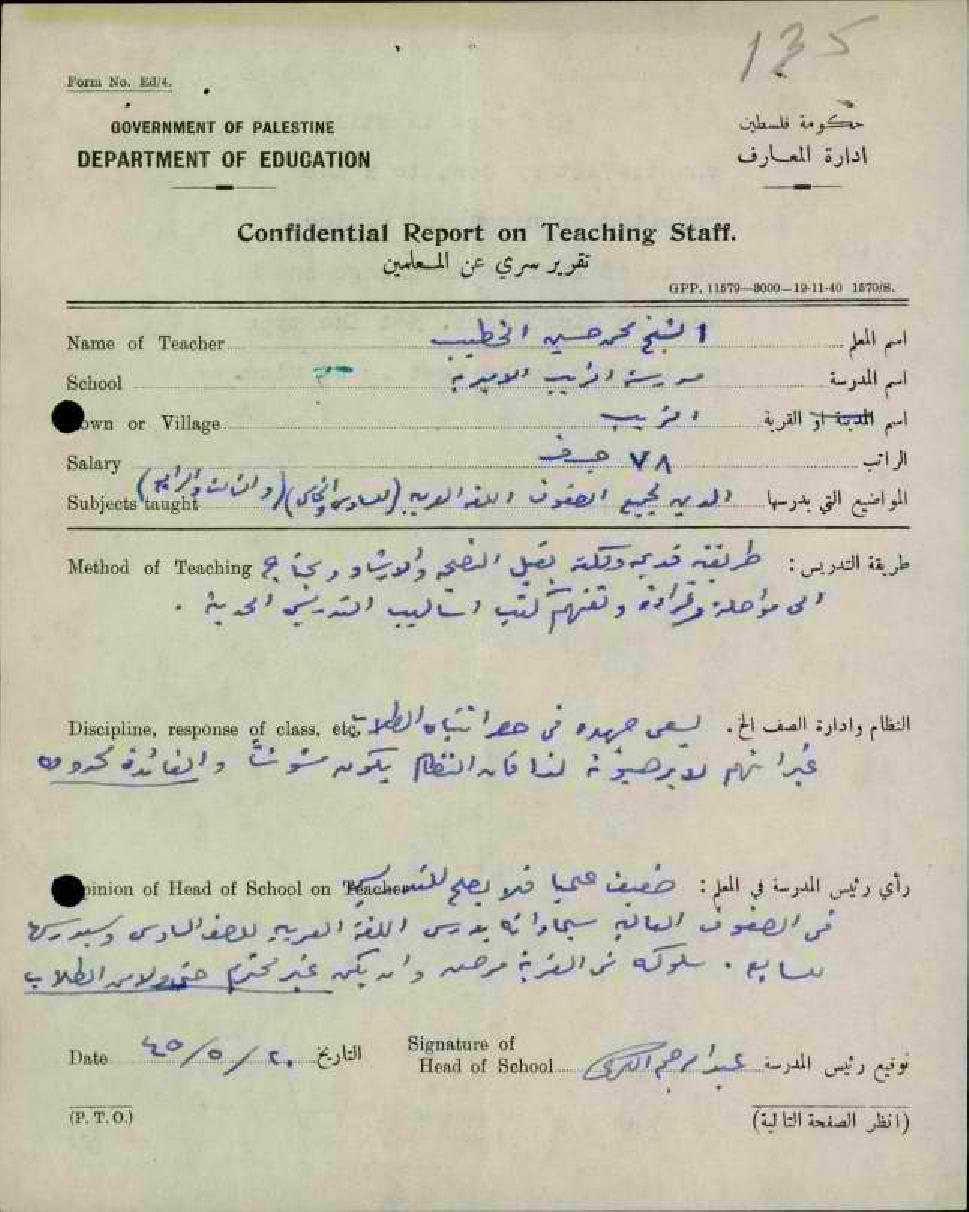 تقرير تفصيلي عن أداء المعلم محمد الخطيب في مدرسة الزيب سنة 1945